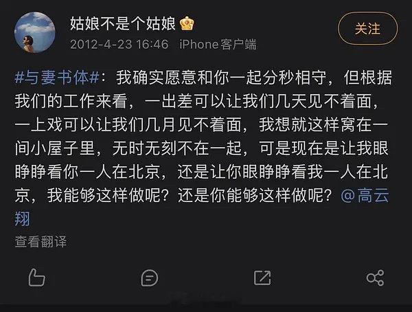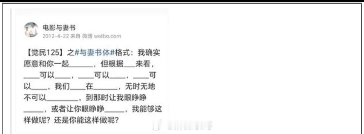 12年的时候,张婉婷发博文,参加话题与妻书体 ,还艾特了高云翔(图5)。这是玩的电影里的梗,但是不是有一些没有分寸,大家辨别。