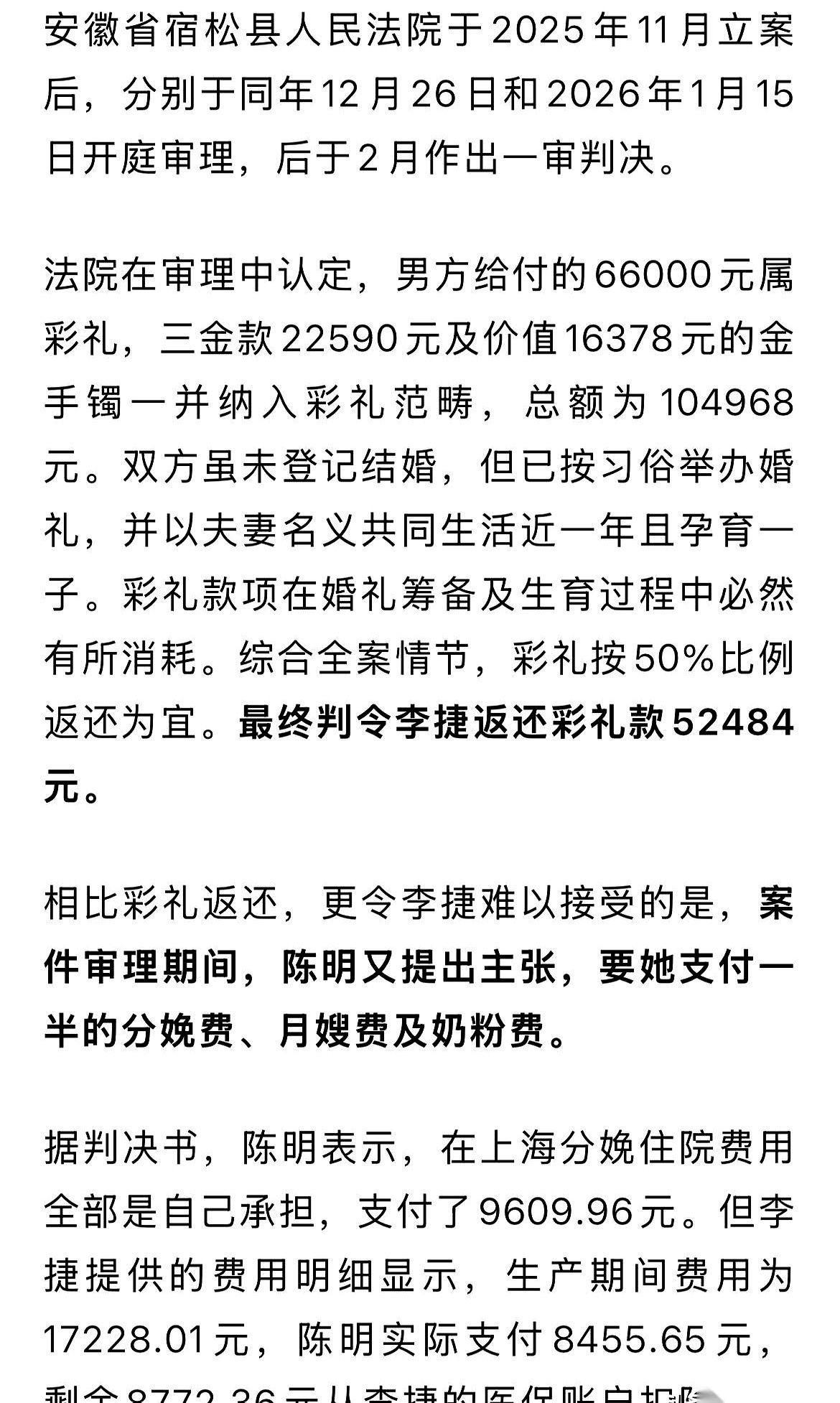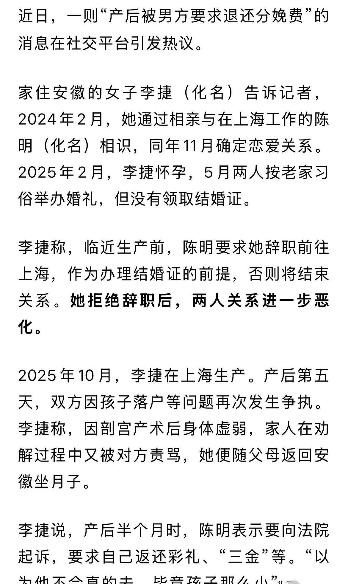 孩子刚出生5天,安徽来的李婕还在月子里,一张法院传票就贴脸上了。告什么?告她归还彩礼三金,还要她支付分娩费、奶粉费、月嫂费。