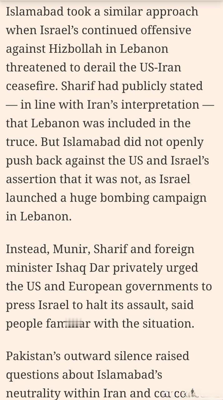 4月8日就在巴基斯坦宣布促成停火后不久,以色列立即对黎巴嫩发动大规模轰炸。而伊斯兰堡方面对以色列违反停火的行为保持沉默,巴基斯坦总司令阿西姆·穆尼尔和外交部长伊沙克·达尔私下而非公开敦促美国官员约束以色列,这进一步加剧了伊朗对巴基斯坦的不信任。