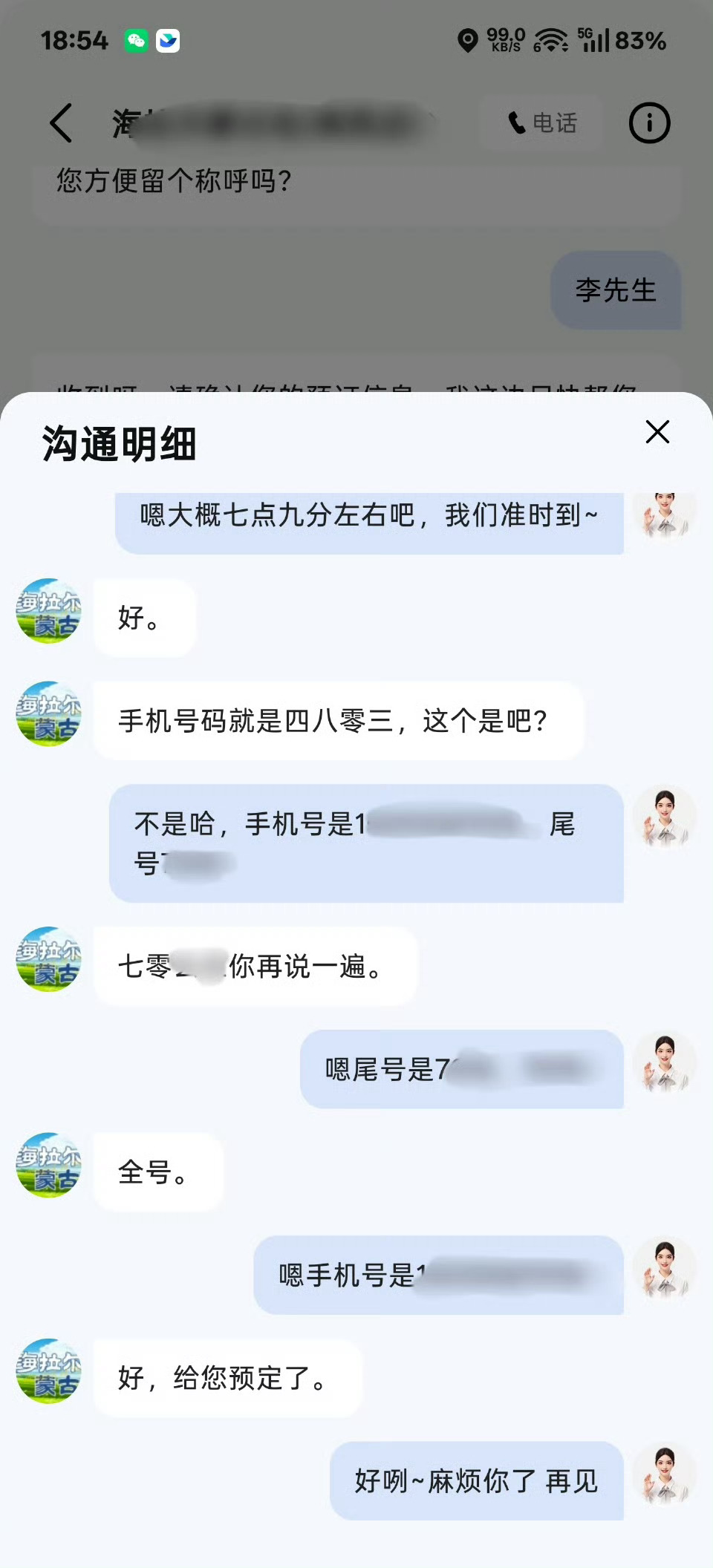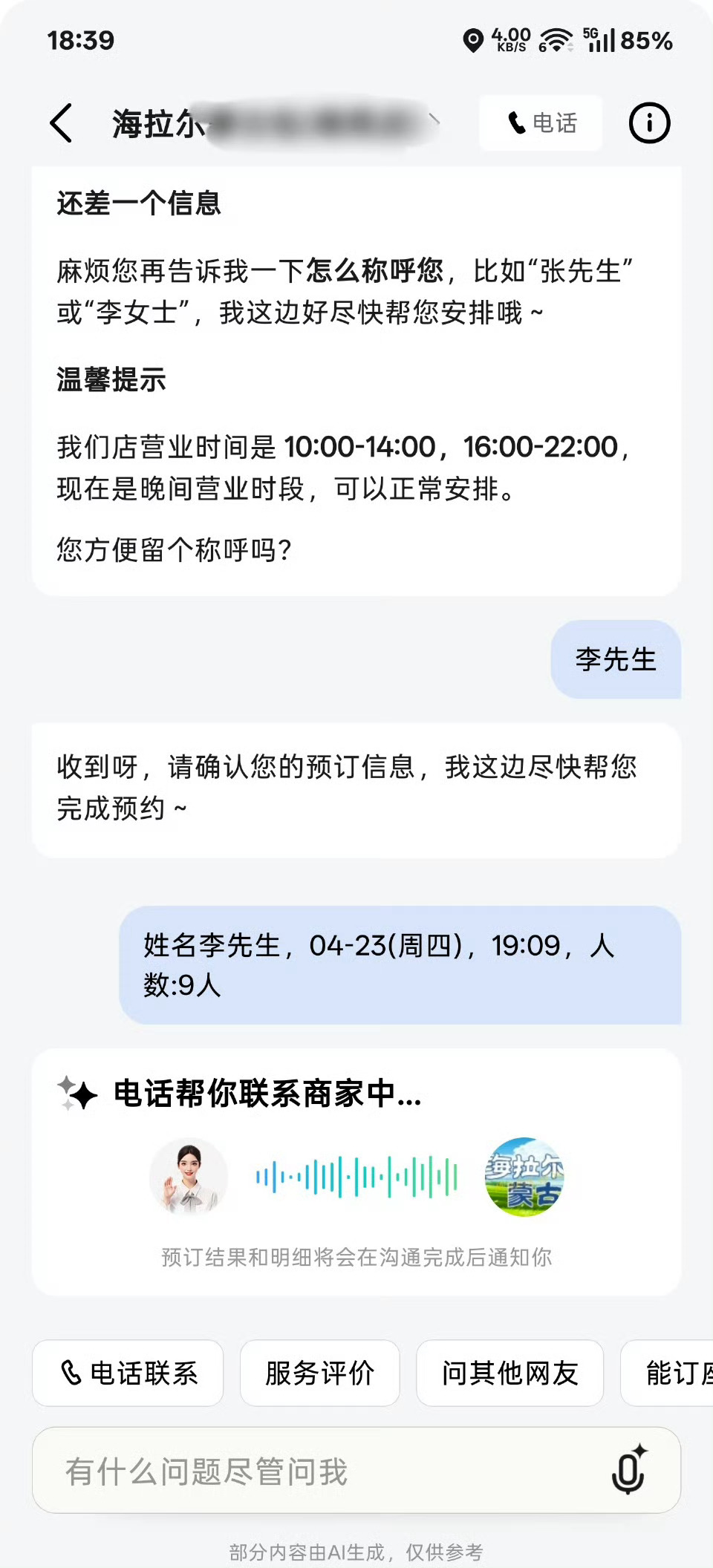 只需要告诉 AI 用餐人数、到店时间和姓名后,它会自动打电话给商家帮你预定。预定完成后,你还可以查看整个对话记录好家伙有点厉害👍
