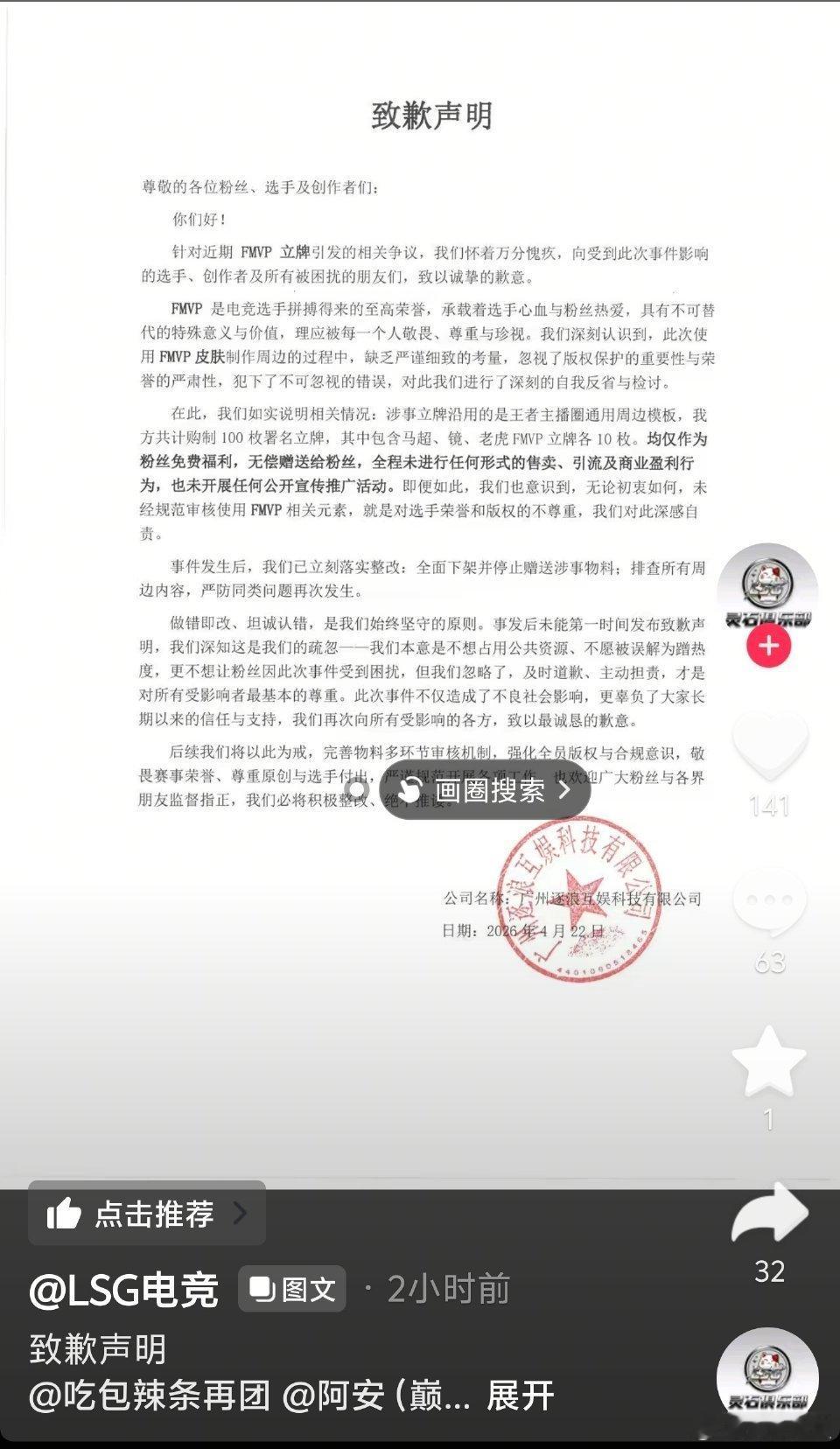 关于游戏主播盗用Fly个人FMVP皮肤-无双飞将在其上署名之事,Fly后援会已反