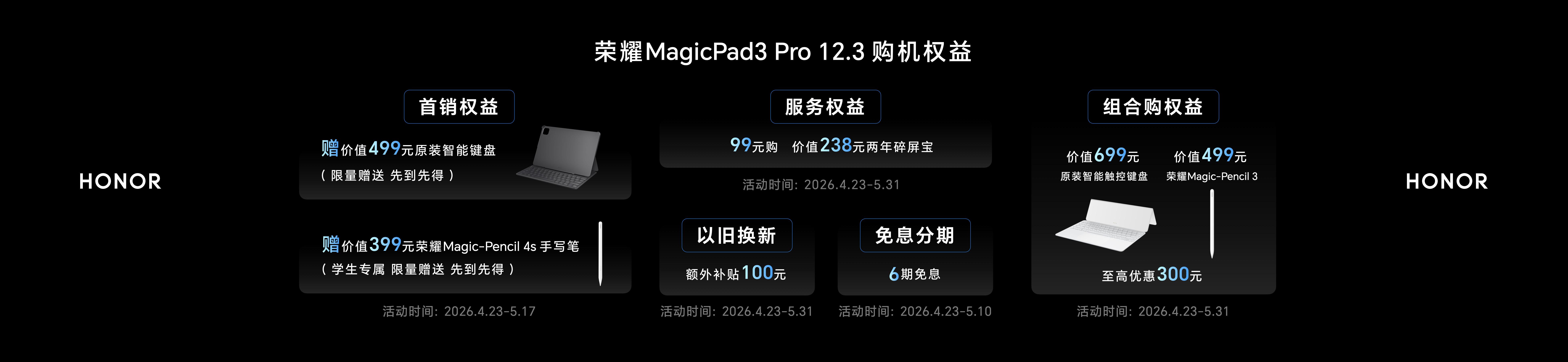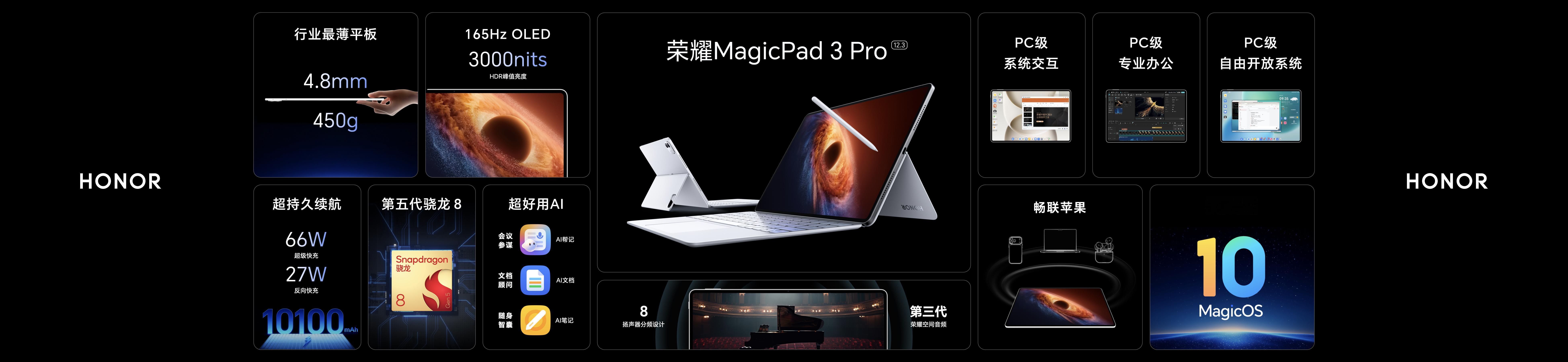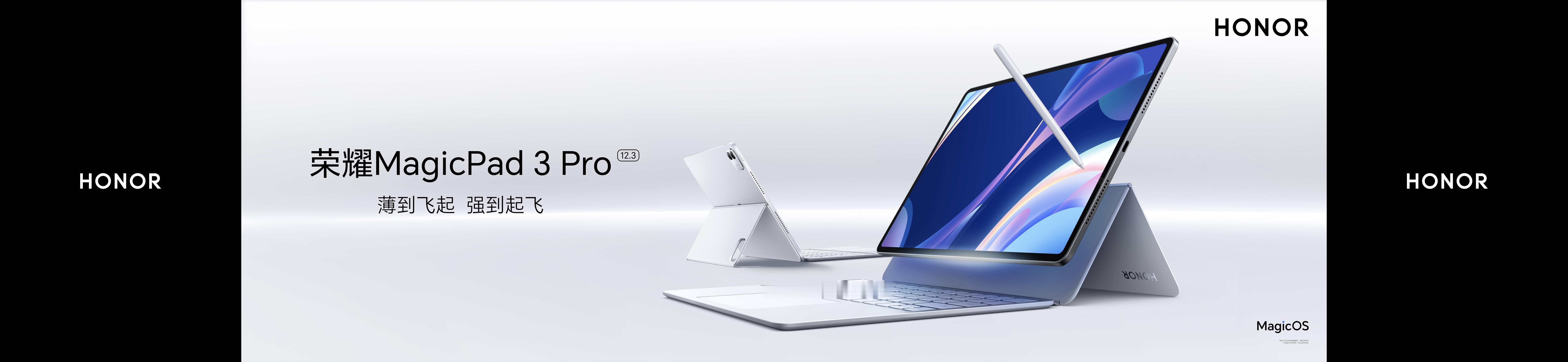 荣耀发布MagicPad3 Pro 12.3平板,国补优惠价3499元起。机身厚4.8mm、重450g,为全球最薄OLED旗舰平板,配备3K 165Hz护眼OLED屏。搭载骁龙8至尊版,10100mAh电池+66W快充,支持Wi-Fi 7与八扬声器。该机为行业首款安卓+Linux双系统平板,支持安全“养虾”部署,搭配强劲PC模式与跨生态