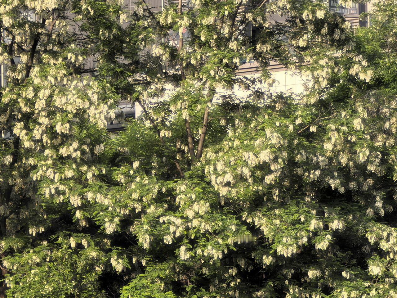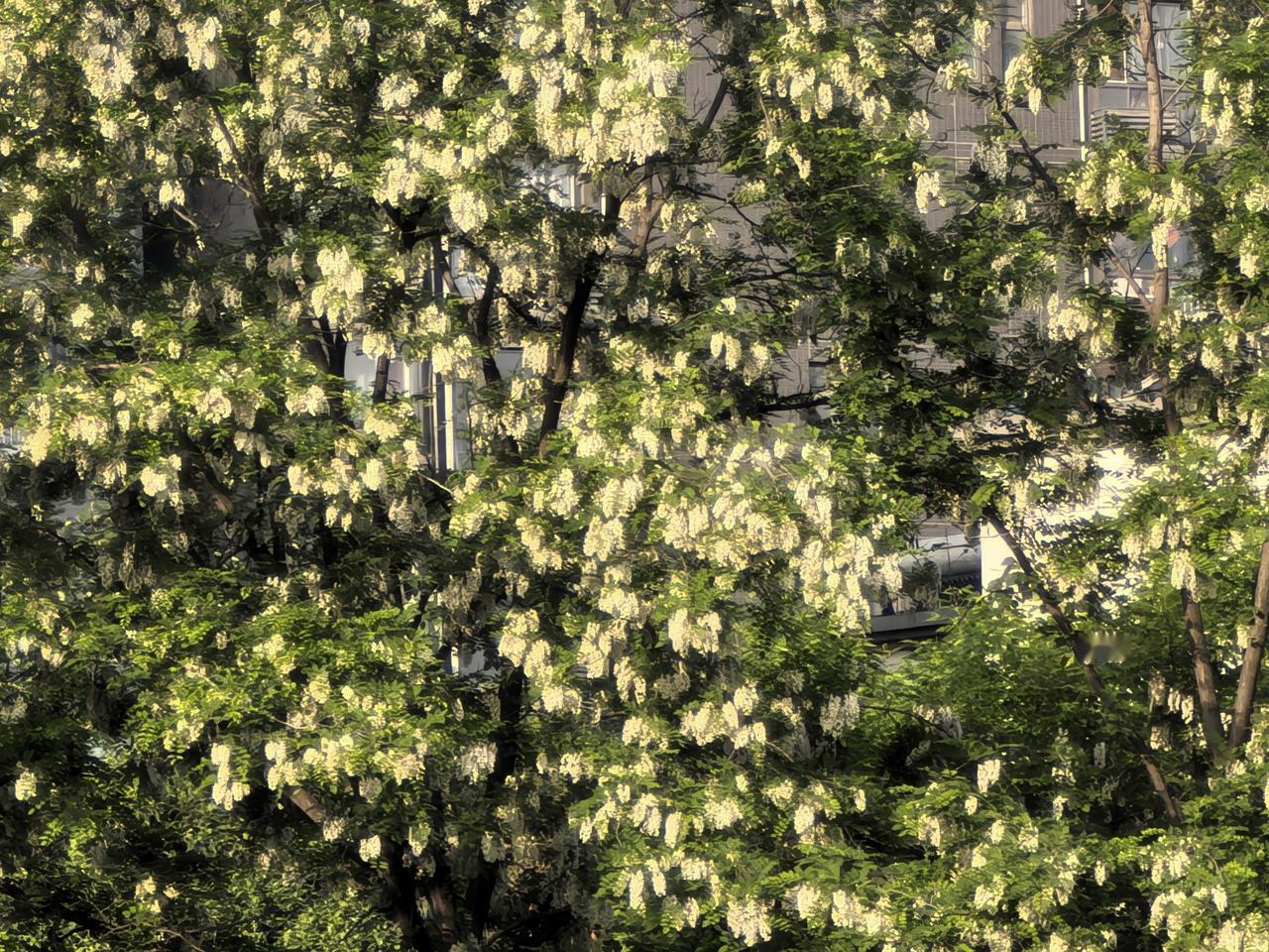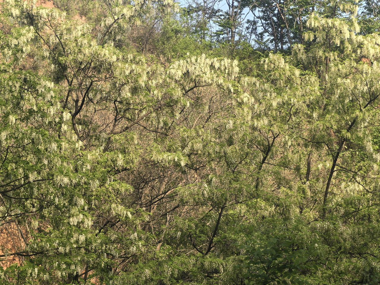 槐花盛开的景象还是很美的,像碎玉、繁星缀满枝头。林间百鸟高歌,蜜蜂、彩蝶来回穿梭,田间农人劳作,构成一幅春日优美画卷。槐花香气淡雅,似悠扬小曲拨动心弦。在这样的场面里,和老娘一起摘槐花,格外温馨。现在想起来都心潮难平。