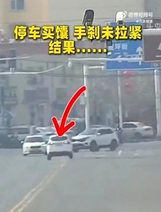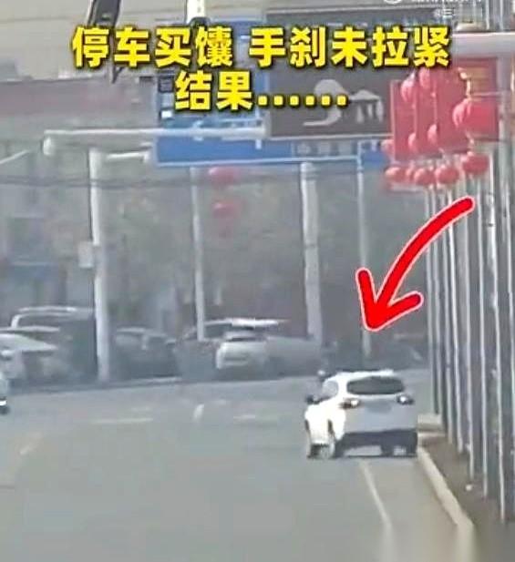 是她自己下车太急,手刹只拉了一半,车自己“溜”下去了。