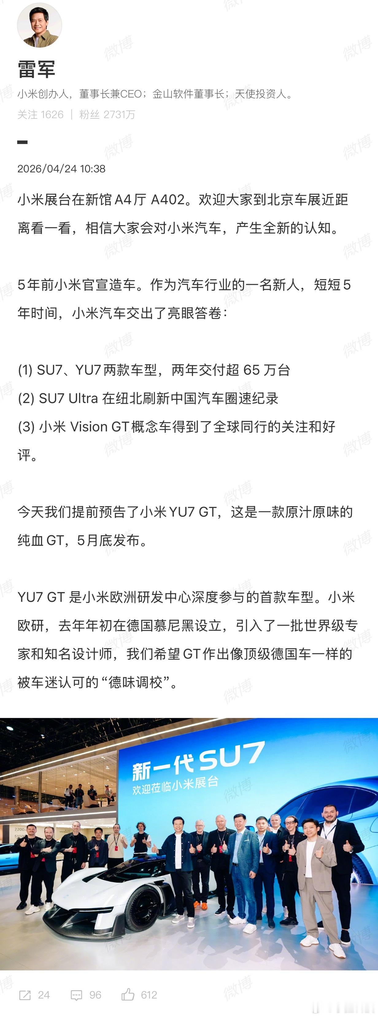 雷军官宣小米YU7GT5月底发布之前就一直猜,现在终于来了!雷军亲自官宣,官方同步放出官图,直接让汽车市场沸腾了。蓄势待发的战马姿态,搭配跑车级的宽体设计,自带强烈的力量感。最让人惊喜的,莫过于它的德味调校。经过德味调校的底盘,扎实且富有质感,能在直道上释放强劲动力,也能在过弯时又快又稳。这种从容的操控感,光是想想就让人期待不已。重点是,它可不是一款只追求性能的“偏科生”,而是真正的纯血GT。专为长途出行而生,既能满足驾驶者对高性能驾驶的刺激追求,又能为乘客提供豪华舒适的乘坐体验,重新定义纯电时代的GT出行方式。据说研发团队非常厉害,来自顶尖工程师的调校,专业性更强,性能更出色。据说,小米YU7 GT已在纽北进行测试。目前纽北排名前列的SUV个个实力强劲,能不能交出一份好的成绩单,还是蛮让人好奇的。不管怎么说,真正的纯电GT要来了,5月底,大家准备好了吗?