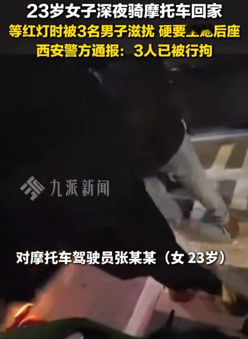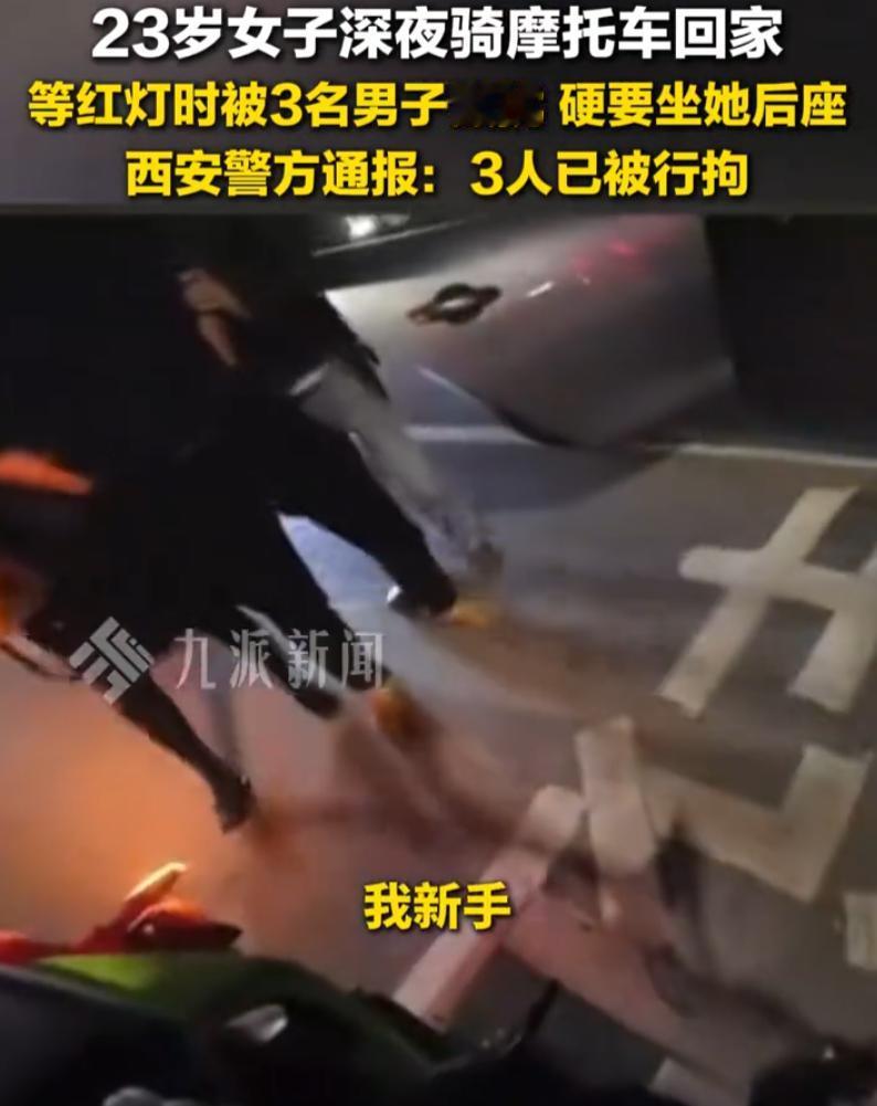 陕西西安,一名23岁姑娘晚上骑摩托车回家。在路口等红灯的时候,旁边一辆轿车里下来三个男人,按住她的手,强行坐上了她的摩托车后座。姑娘被吓得尖叫。整个过程被她自己拍了下来。报警之后,警方很快出了通报:三个男的,全部行政拘留