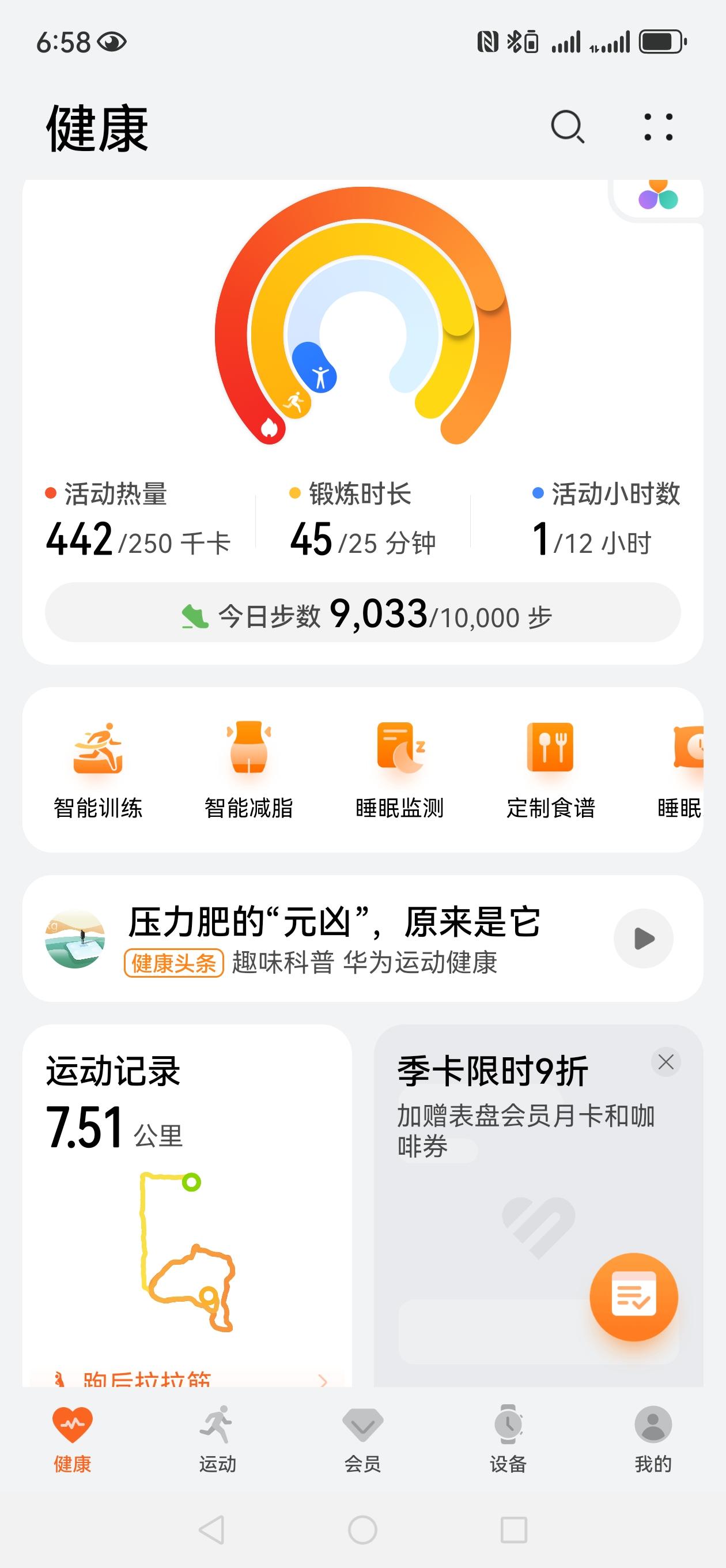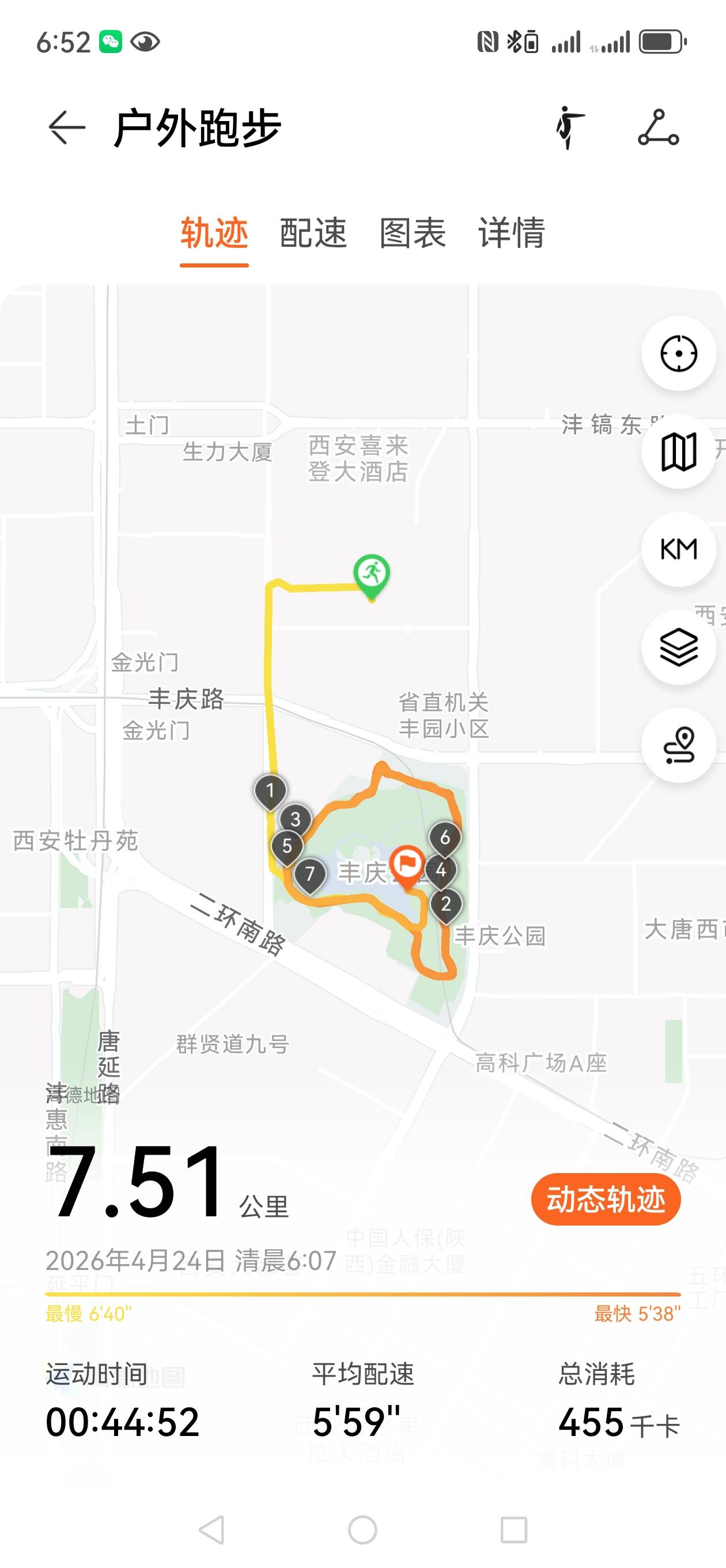 今日晨跑打卡,中慢跑7.51公里,用时44分52秒,消耗热量455千卡,爽歪歪。