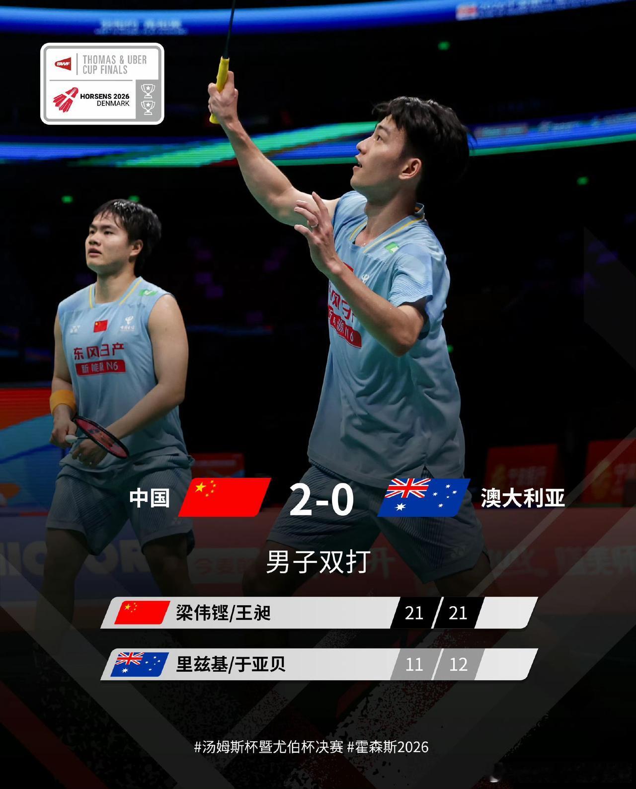男队对阵澳大利亚队,石宇奇和梁伟铿/王昶在前两场比赛中轻松获胜,国羽2-0领先。