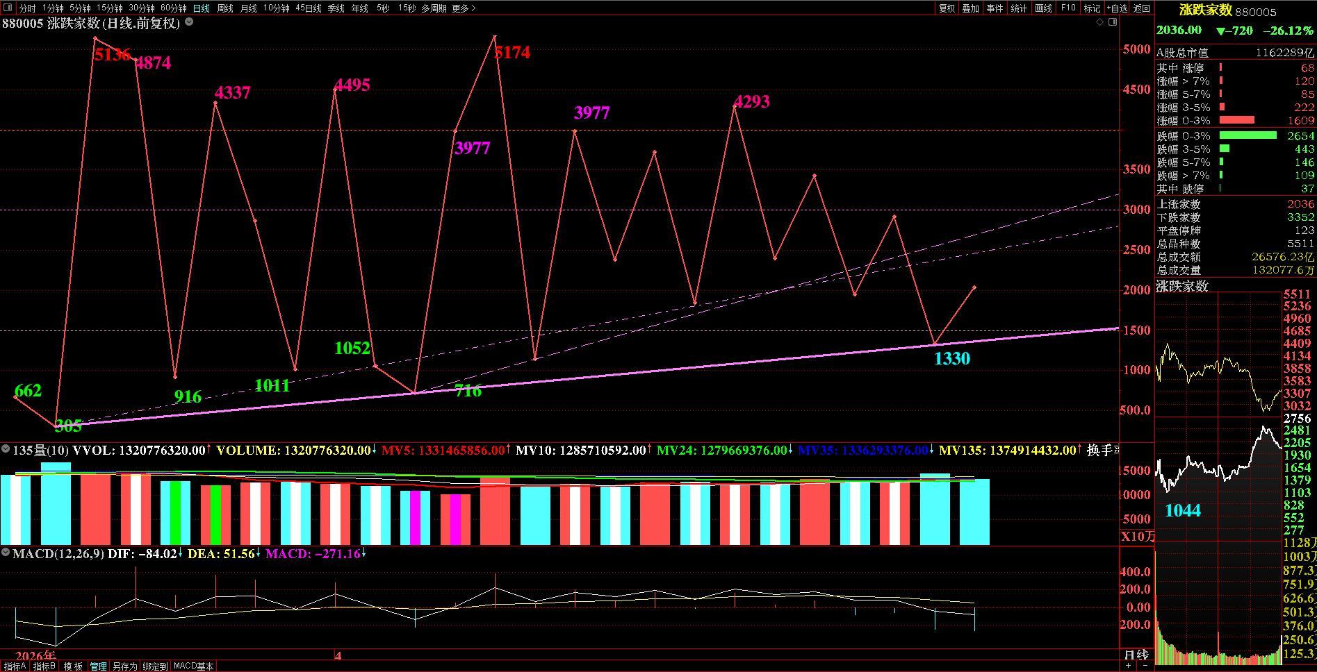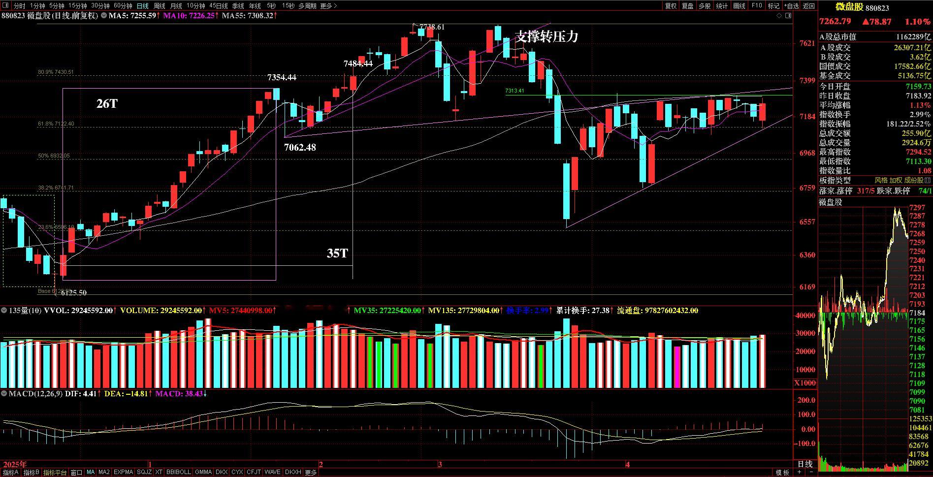 主力资金净买7股超10亿——————————————主力资金上午继续大卖,午后将近半小时的时候,最多净流出超过680亿元,随着主要指数分时小双底形成,主力资金逐步回流,收盘净流出574亿元。卖不完的主力资金,A的“慢牛”比3000点左右“稳”得多了。主力资金净流出超200亿元有12个东财板块,融资融券540亿元居首,“老面孔”们还是大卖。主力做多板块集中在电池类,包括锂电池、电池技术、锂矿、固态电池、动力电电池回收、钠离子电池。主力资金净流入超10亿元7只个股,新股N联讯24.7亿元居首,包括宁德时代、多氟多、贵州茅台、天齐锂业、海光信息、赣锋锂业,它们大多是高价股,流通盘大,没有涨停股。在主力资金净流入超亿元个股中,有不少高价、流通盘较大个股。东财小盘股(BK1643)1000只成分股,收涨289只,占比不足三成,70只涨超3%,将近七成收跌。这种现象似乎再次验证了之前的判断:部分主力资金的“主攻”方向转向“蓝筹”和高价大中盘股。指数反映到微盘股3月24日到4月24日23天涨幅10.46%,落后于深证成指11.95%、创业板指13.37%。与2025年4月8日到5月13日同样23天比较,微盘股涨幅23.58%,远超深证成指9.86%、创业板指14.11%。两段微盘股指数涨幅差异超过一半,深市两大指数也“落后”,实际反映到个股活跃度,同样差得多。数据比较,就不难理解近个把月的个股走势不够好,赚钱效应也差强人意了。目前,微盘股指数下有支撑、上方压力尚存。支撑位是“双线”:一是6125.50点到7738.61点黄金分割61.8%分位;二是3月23日、4月3日两天低点连线。两条线今天交汇,地点正好探到后V型反转回升。压力位还是“三条线”:一是MA55;二是3月20日破位大阴线开盘点;三是1月27日、3月4日低点连线。在没能突破三条线压制前,个股整体难以活跃。今天微盘股指数的运行就在压力位和支撑位之间,收涨1.10%,比昨天放量5亿元,站上MA5/10。继续维持判断:突破“三条线”压力,才有稍乐观的个股行情。微盘股指数小涨,个股行情比昨天就稍好。上涨2036只,涨停68只,都比昨天1330只、58只多些。涨跌家数有个短期“支撑”趋势现象,3月23日和4月3日收涨家数连线,昨天“恰好”落在线上,昨天盘中最低上涨家数1011只,今天1044只,都没有“破千”,似乎市场承接力有所增强。当然,这需要后续市场验证。A股的规律就是间歇性“阴极”成为阶段“冰点”,才有转阳的走势。下周还有4个交易日就进入“五一”小长假,假期前的做多动能依然不足,估计还是弱势运行为主基调。A股市场主力资金净流出微盘股指数