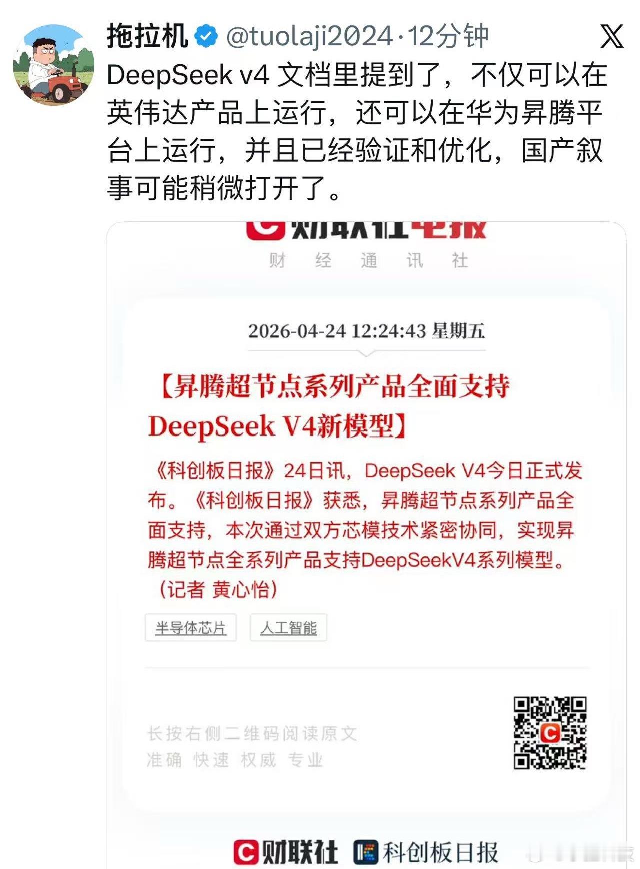 DeepSeekV4深度适配国产算力美国人还在责怪黄仁勋想卖高端芯片给中国,老黄一直辩解不卖老中也能造出来,这下DeepSeek V4发布打破了英伟达的生态垄断。