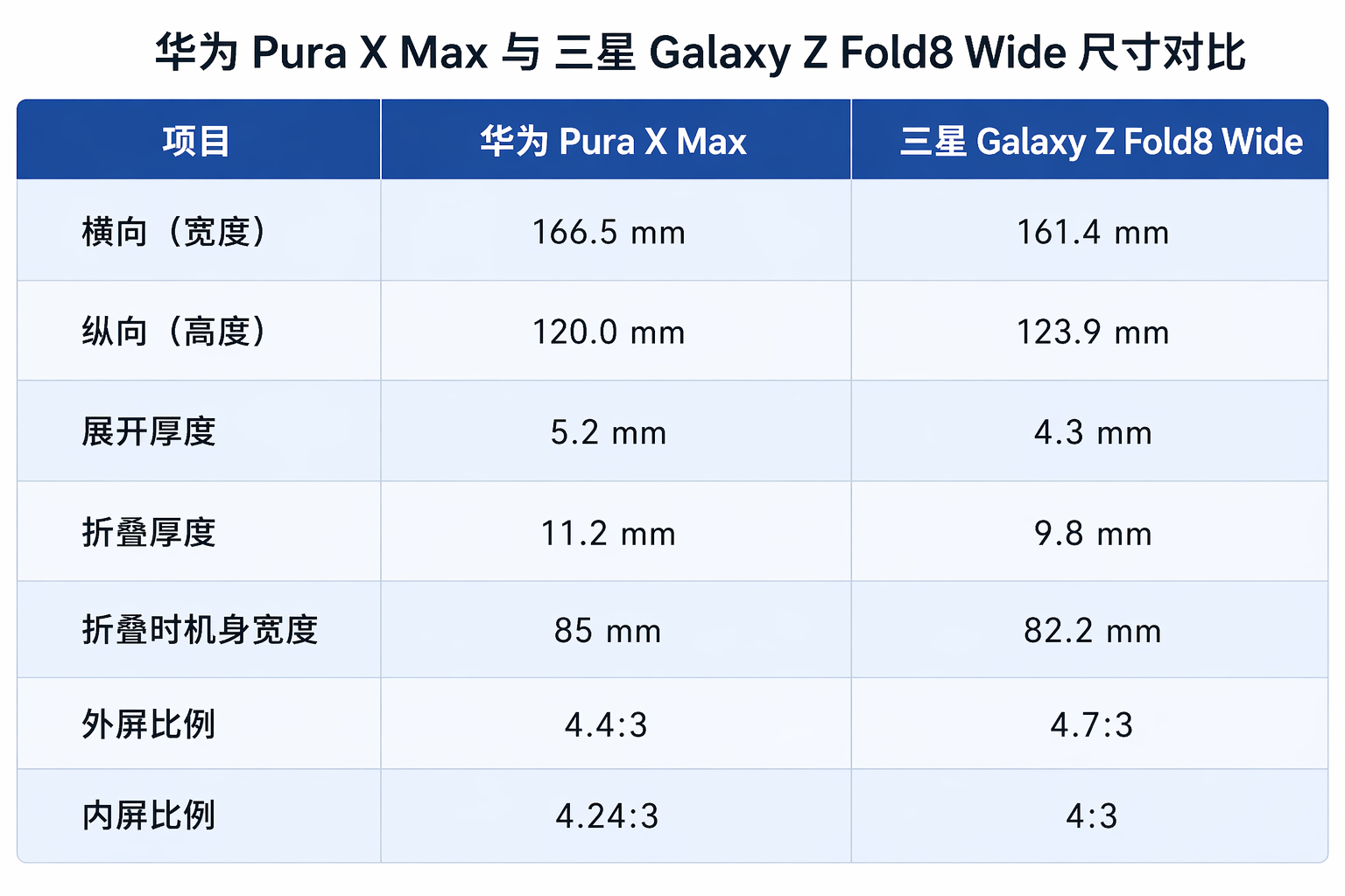 独家!基于官方数据对比,华为 Pura X Max 和 三星Galaxy Z Fold8 Wide 大小对比。机身三维:华为: 横向:166.5mm,纵向:120.0mm,展开厚度:5.2mm,折叠厚度11.2mm,折叠时机身宽度:85mm,外屏比例:4.4:3,内屏比例:4.24:3三星: 横向:161.4mm,纵向:123.9mm,展开厚度:4.3mm,折叠厚度9.8mm,折叠时机身宽度:82.2mm,外屏比例:4.7:3,内屏比例:4:3