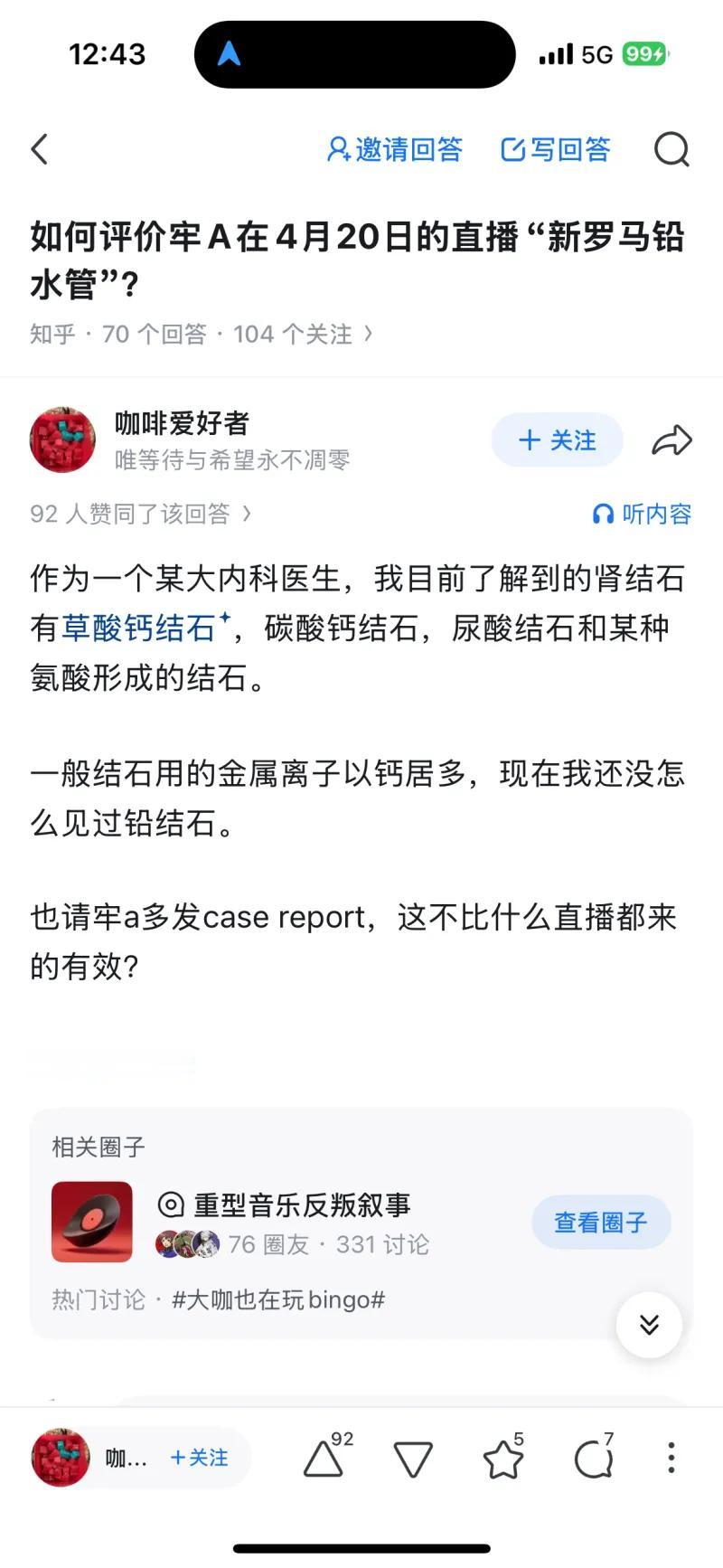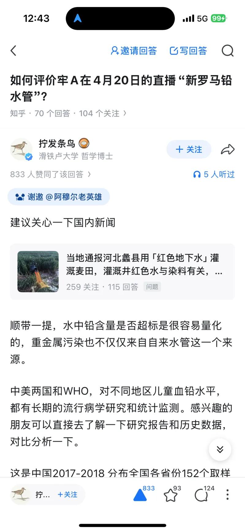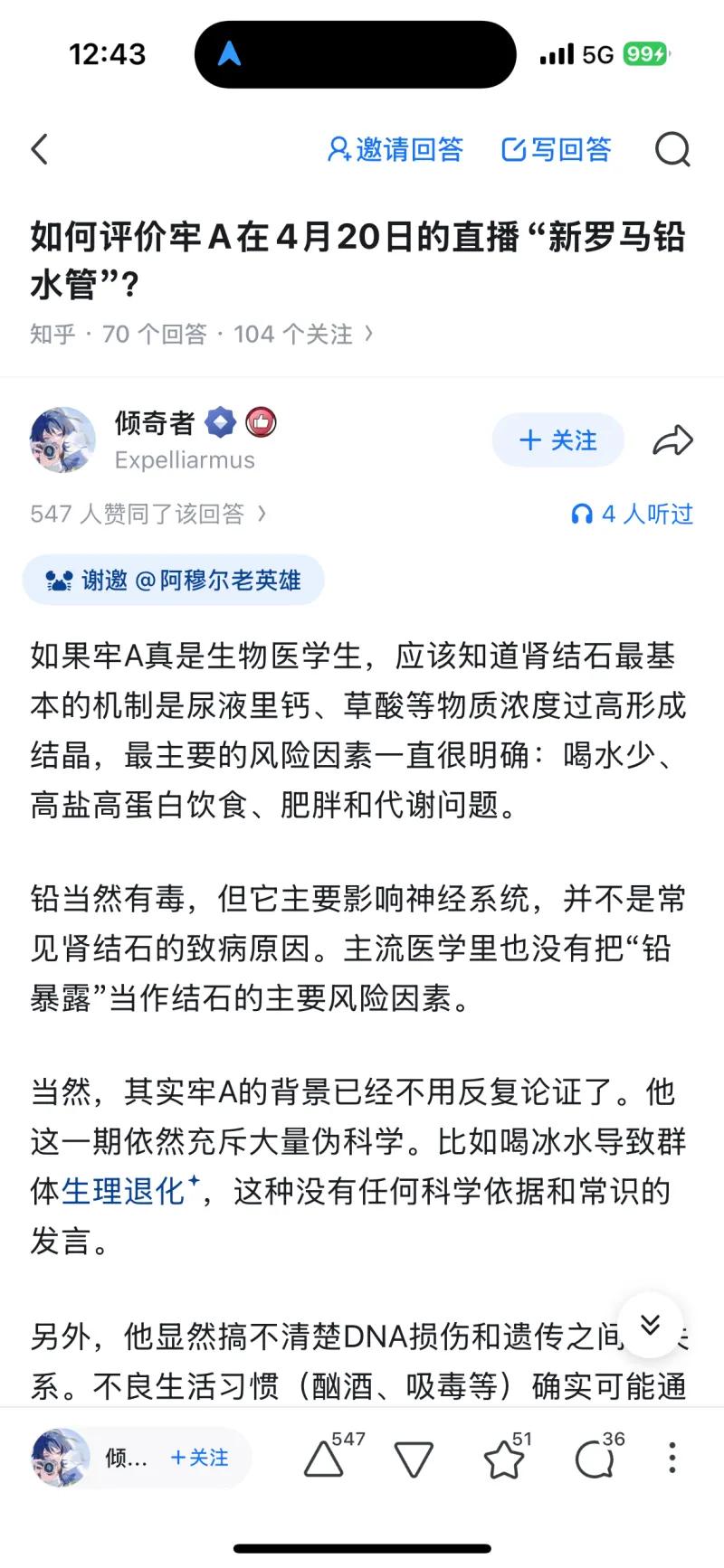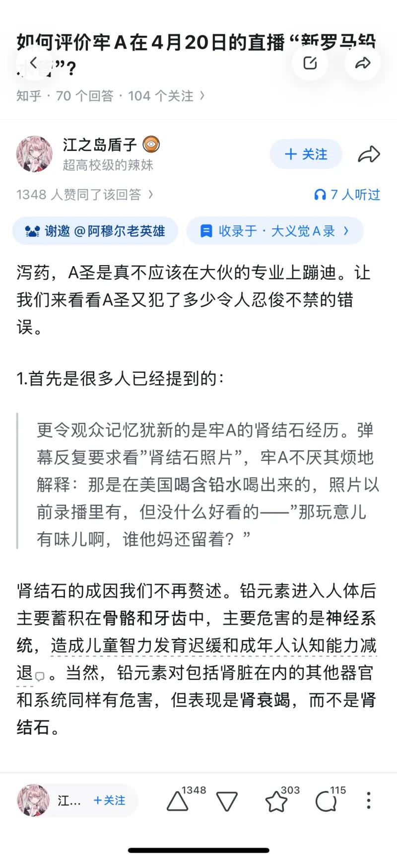 这张截图来自知乎平台,内容是网友对 B 站 UP 主 “牢 A”(Alex)4 月 20 日一场主题为 “新罗马铅水管” 直播的调侃式吐槽。直播中,牢 A 围绕古罗马铅水管问题展开讨论,却出现了不少违背基础科学常识的言论,比如声称 “人体细胞有细胞壁”、强行将铅水管与肾结石挂钩等。截图里的知乎回答便用反讽的语气,夸张地说 “诺贝尔欠牢 A 一个生物学奖”,调侃他的离谱 “发现” 能让生物学家都来 “朝圣”,本质上是网友用一本正经的吹捧,讽刺这场直播内容的不严谨与伪科学倾向。