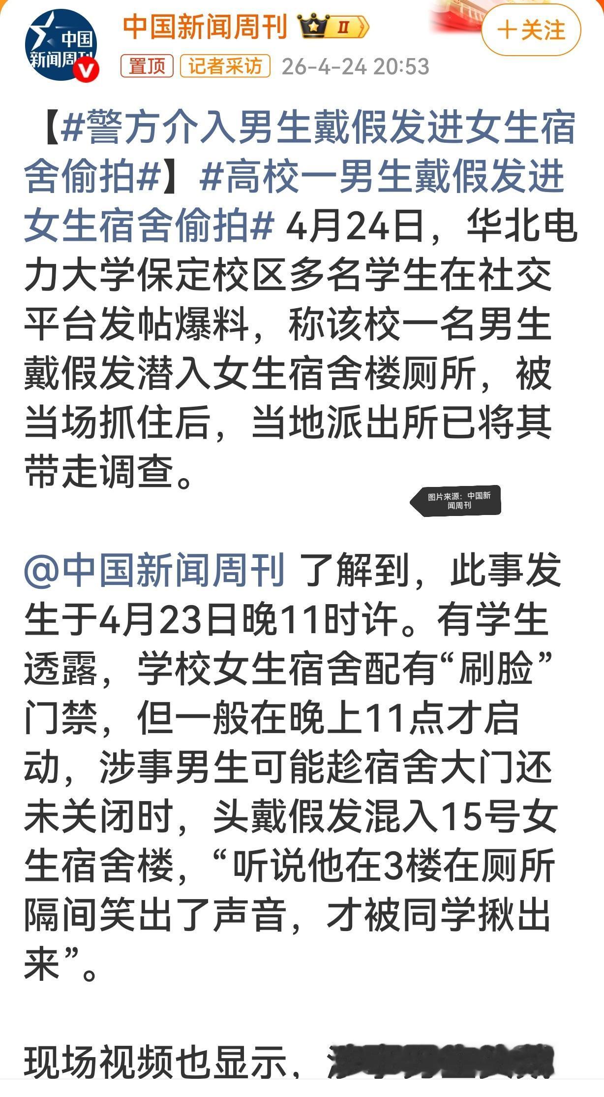 4月23日晚,华北电力大学保定校区一名男生,刻意佩戴假发混入女生宿舍。
