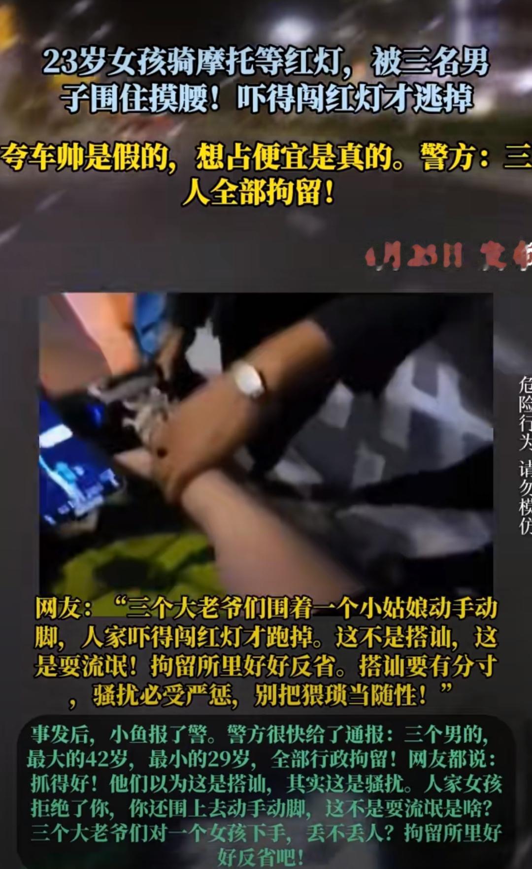 视频曝光的那一刻,无数人隔着屏幕都攥紧了拳头。深夜的路口本应安静平和,女孩只是骑着自己的车正常回家,没有招谁惹谁,没有穿暴露的衣服,没有做出任何出格的举动,却平白无故被三个醉醺醺的陌生男子当成取乐的对象,围在中间肆意骚扰、动手动脚。