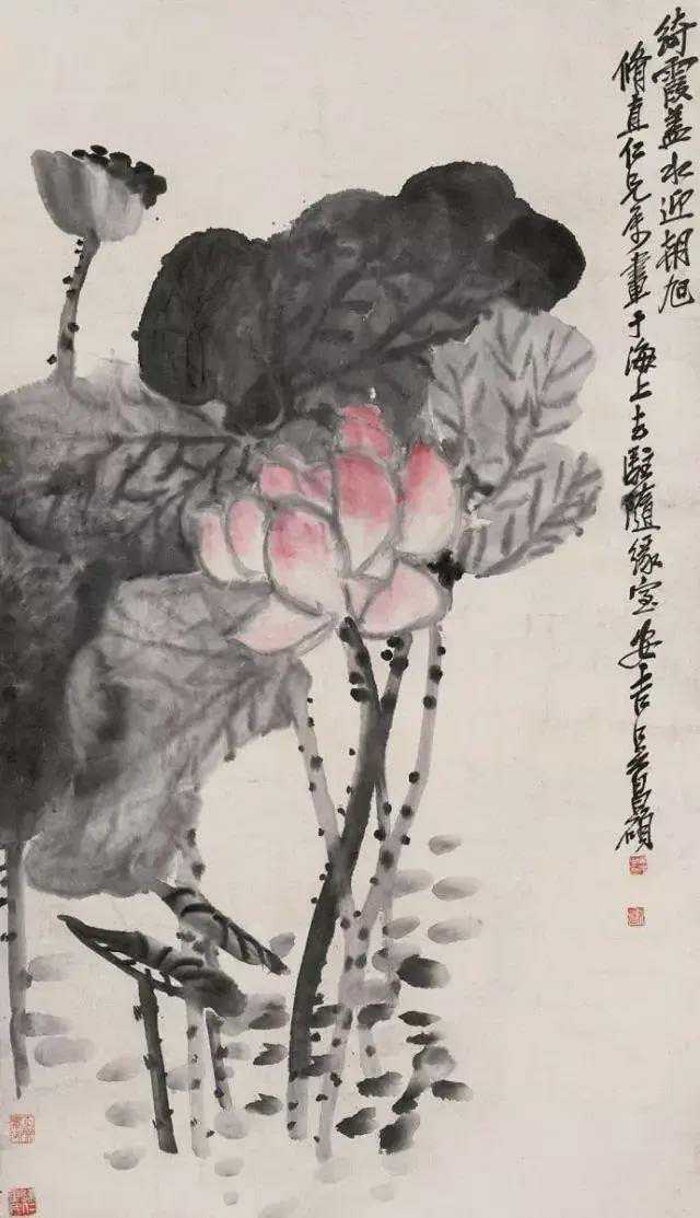 吴昌硕绘画的题材以花卉为主,亦偶作山水。前期得到任颐指点,后又参用赵之谦画法,并