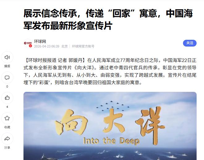 4月22日,人民海军成立77周年,官方发布了主题宣传片《向大洋》,可外媒把咱们的“彩蛋”怀疑成“台湾回归”,看到这个我真的很疑惑:明明是中国的内政,他们有什么资格去指手画脚?
