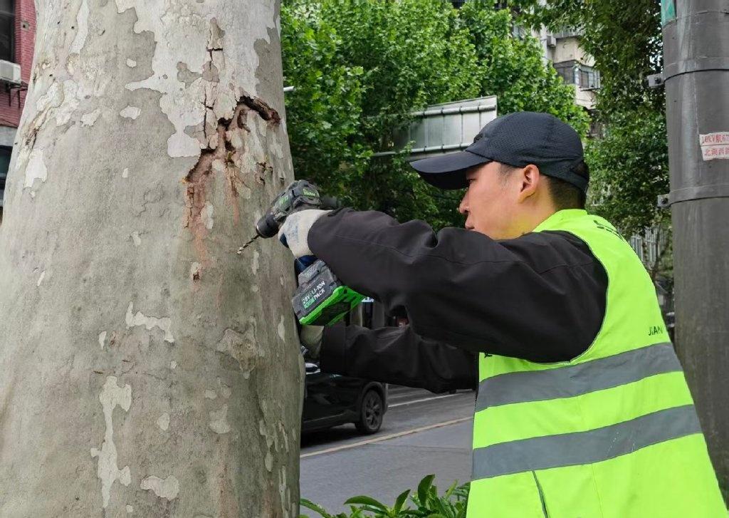 4月24日上午,在江汉区北湖西路,几名绿化工人围着一株法桐忙碌。一人手持电钻,在树干离地约1.3米处斜向下钻出小孔,另一人取出一瓶药剂,旋盖、刺破封口、插“针”,将“针头”稳稳插入孔中,让药液缓缓注入树体。这是江汉区城管执法局今年治理法桐飘絮的新试点:为法桐注射“飞絮抑制剂”。