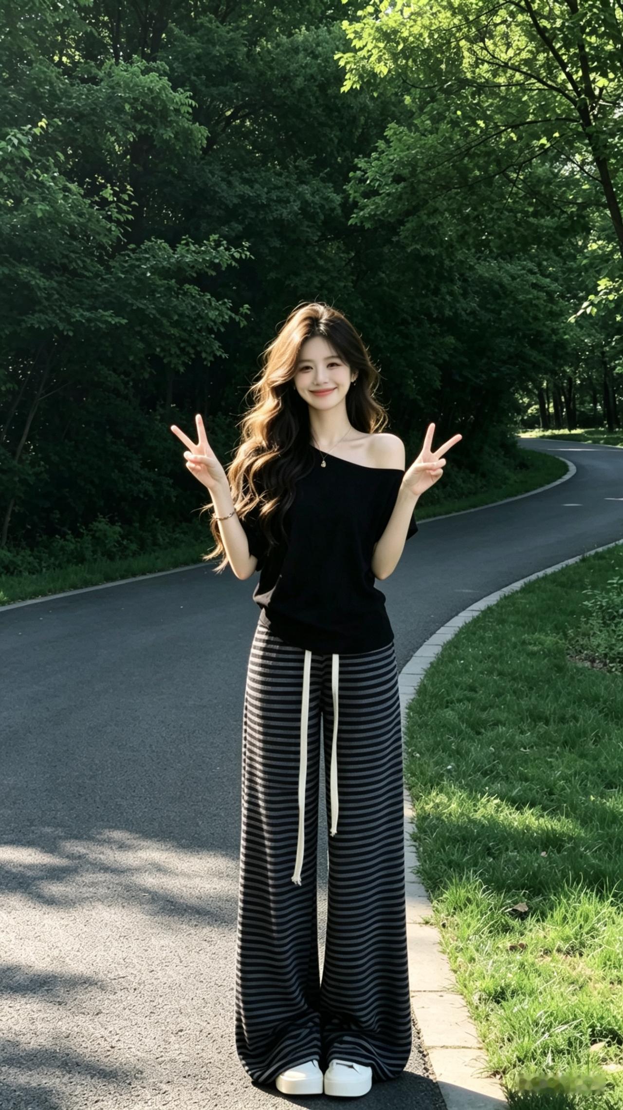 夏日森林中的甜美少女,黑白色调穿搭,清新自然。