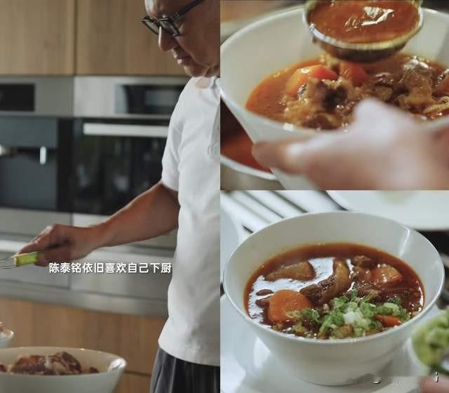 如今69岁的陈泰铭,周末都要加班到凌晨三点。于是,他找到了一套自我平衡的方式,除了音乐和艺术,最重要的就是烹饪煮饭。即使行程再忙碌,他也喜欢自己下厨。视频里,他亲手做的萝卜牛腩汤,色泽红润油亮,看来平时没少在厨房下功夫。