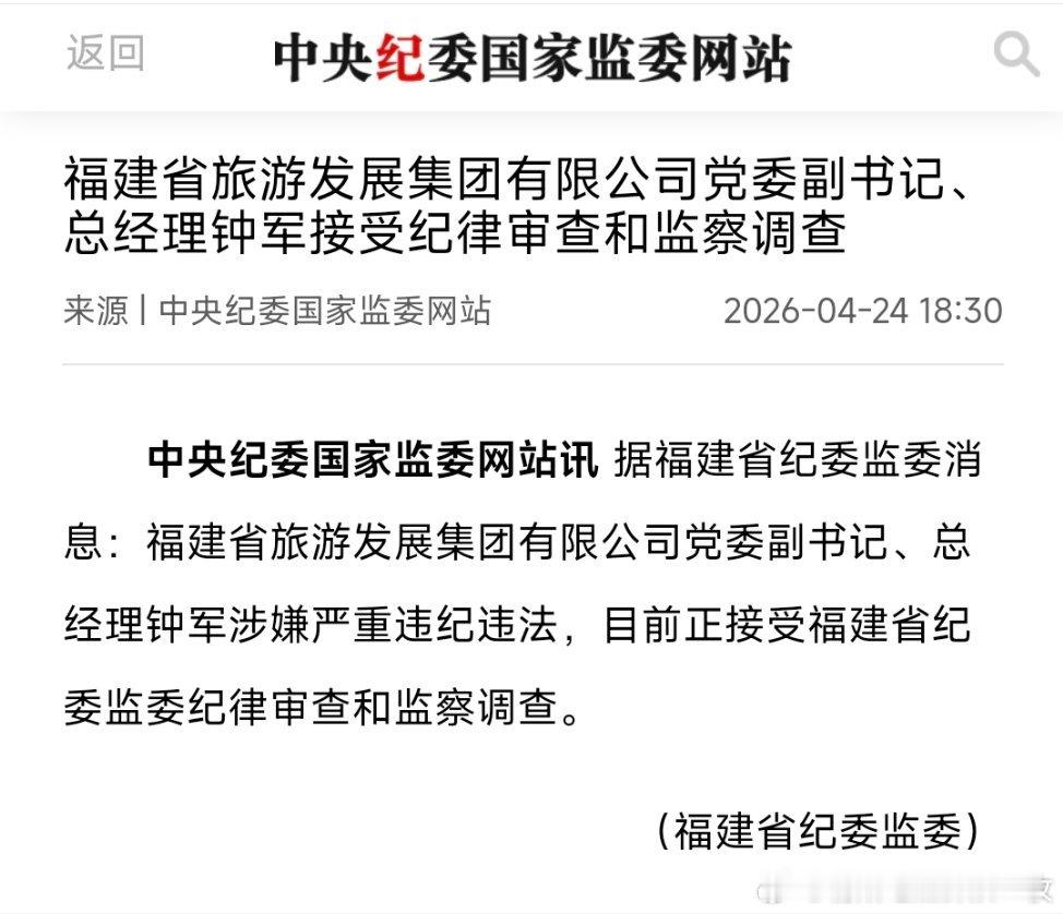 福建省旅游发展集团有限公司党委副书记、总经理钟军接受纪律审查和监察调查。