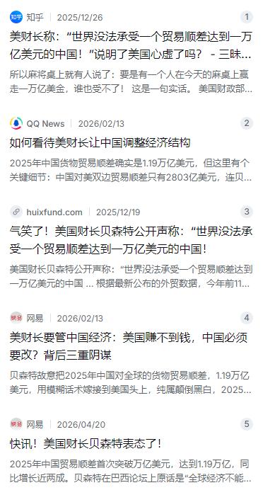 先把账算清楚。 2025年中国对全球的货物贸易顺差确实是1.19万亿美元,但贝森特故意用这个全球数据来指代对美贸易,属于典型的偷换概念。事实是,中美双边贸易顺差只有2803亿美元,连他说的“1万亿”的三分之一都不到。作为一国财政部长,连基本数据都懒得核实就敢指着中国鼻子说事,这账算得也太潦草了。