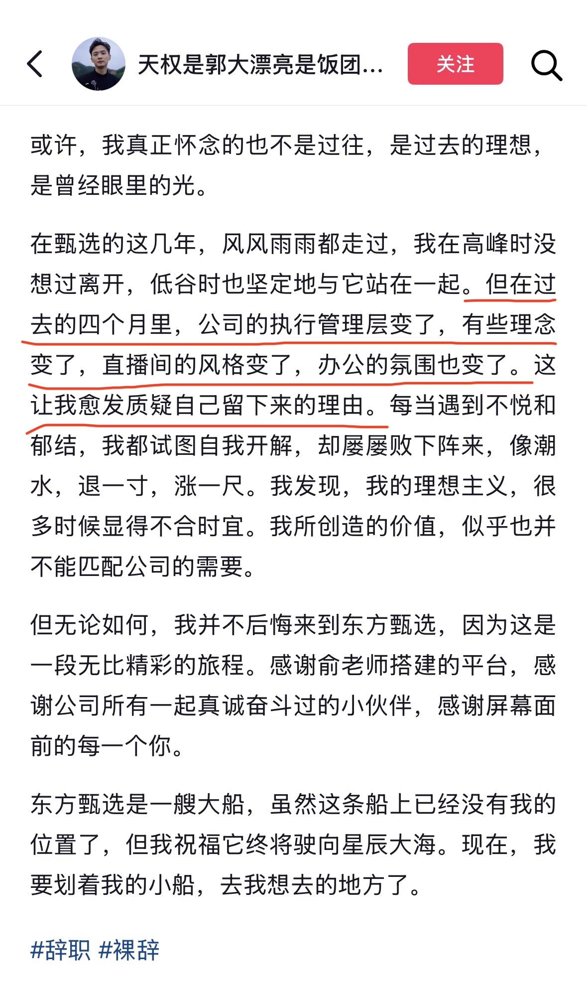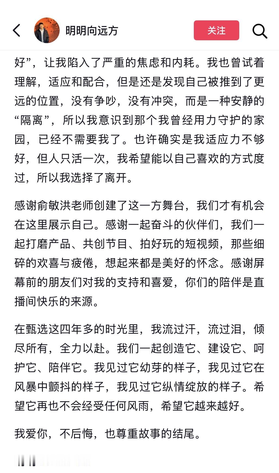 东方甄选主播明明天权回应,离开是公司整体直播模式与运营风格改变,自己创作的价值不能匹配公司需求。