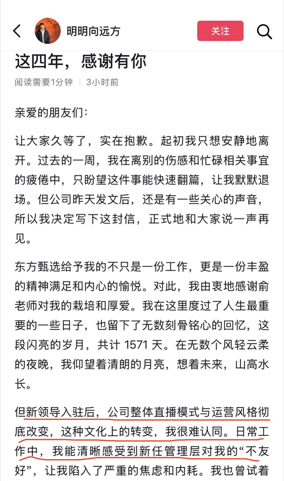 昨天东方甄选发文公布主播明明和天权离职,今天明明和天权同时发文回应“再见东方甄选”和“这四年感谢有你”。