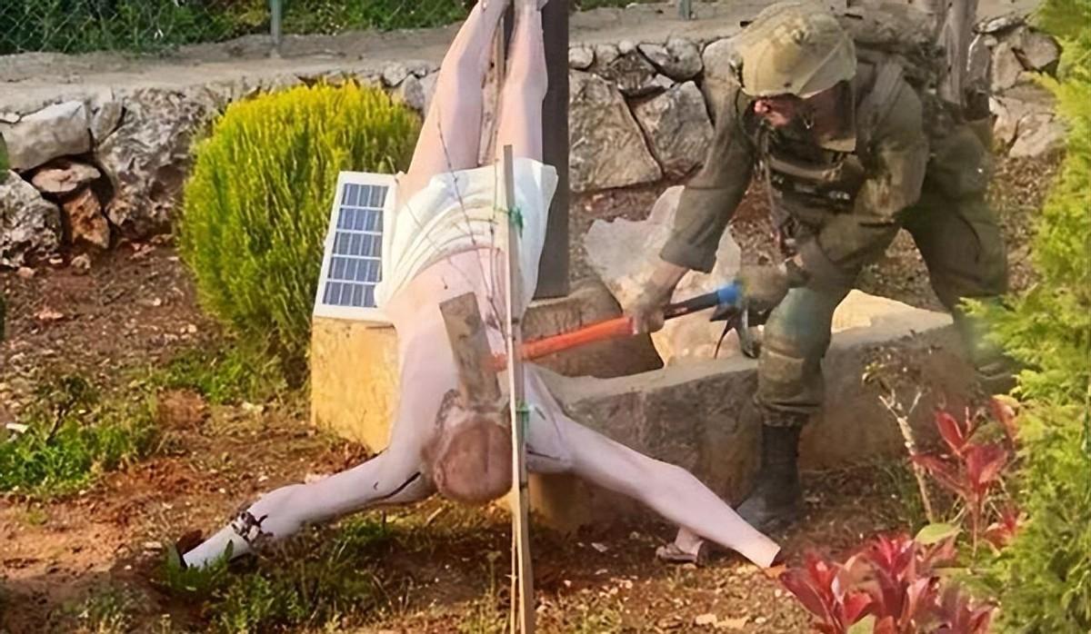 在黎巴嫩南部,一名以色列士兵手持大锤,疯狂打砸一尊已经倒地的耶稣雕像。