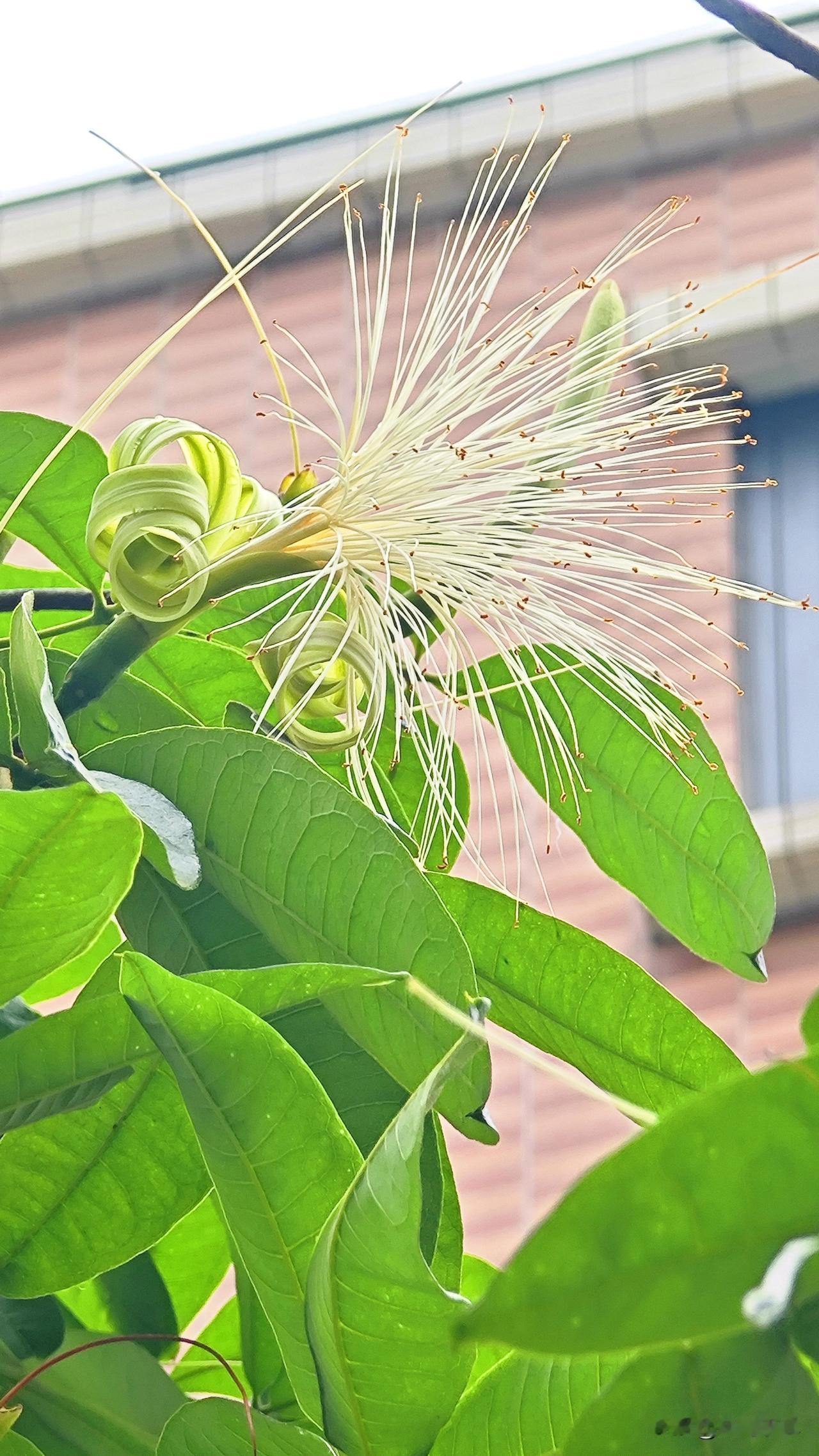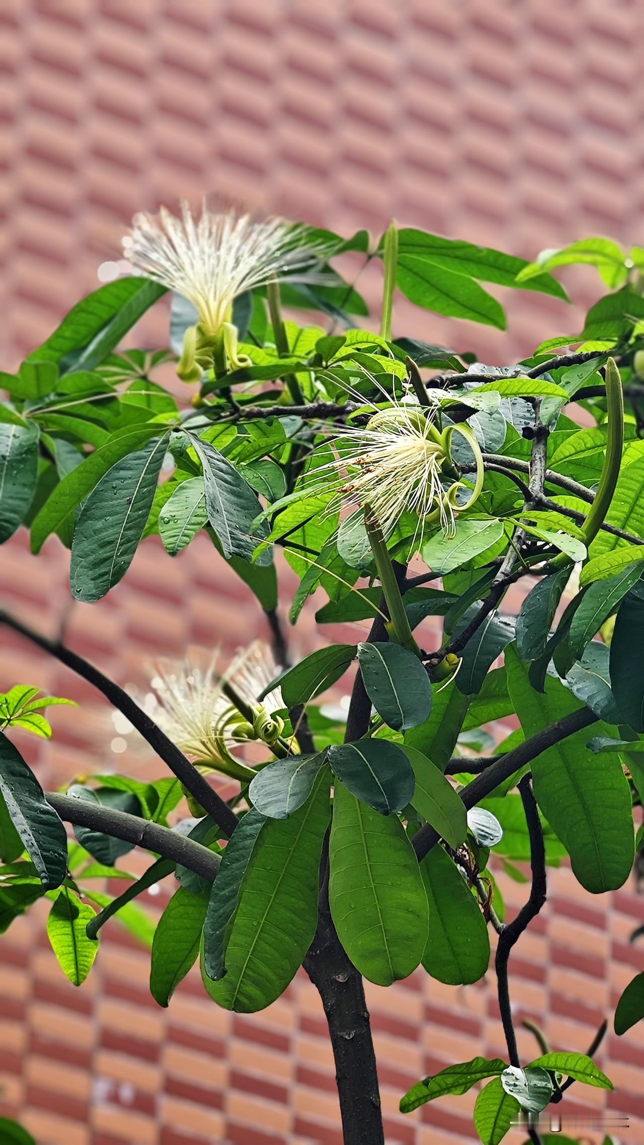小区里的一棵发财树开花了! 一大把细长、放射状的白色花丝,是它的雄蕊。发财树开