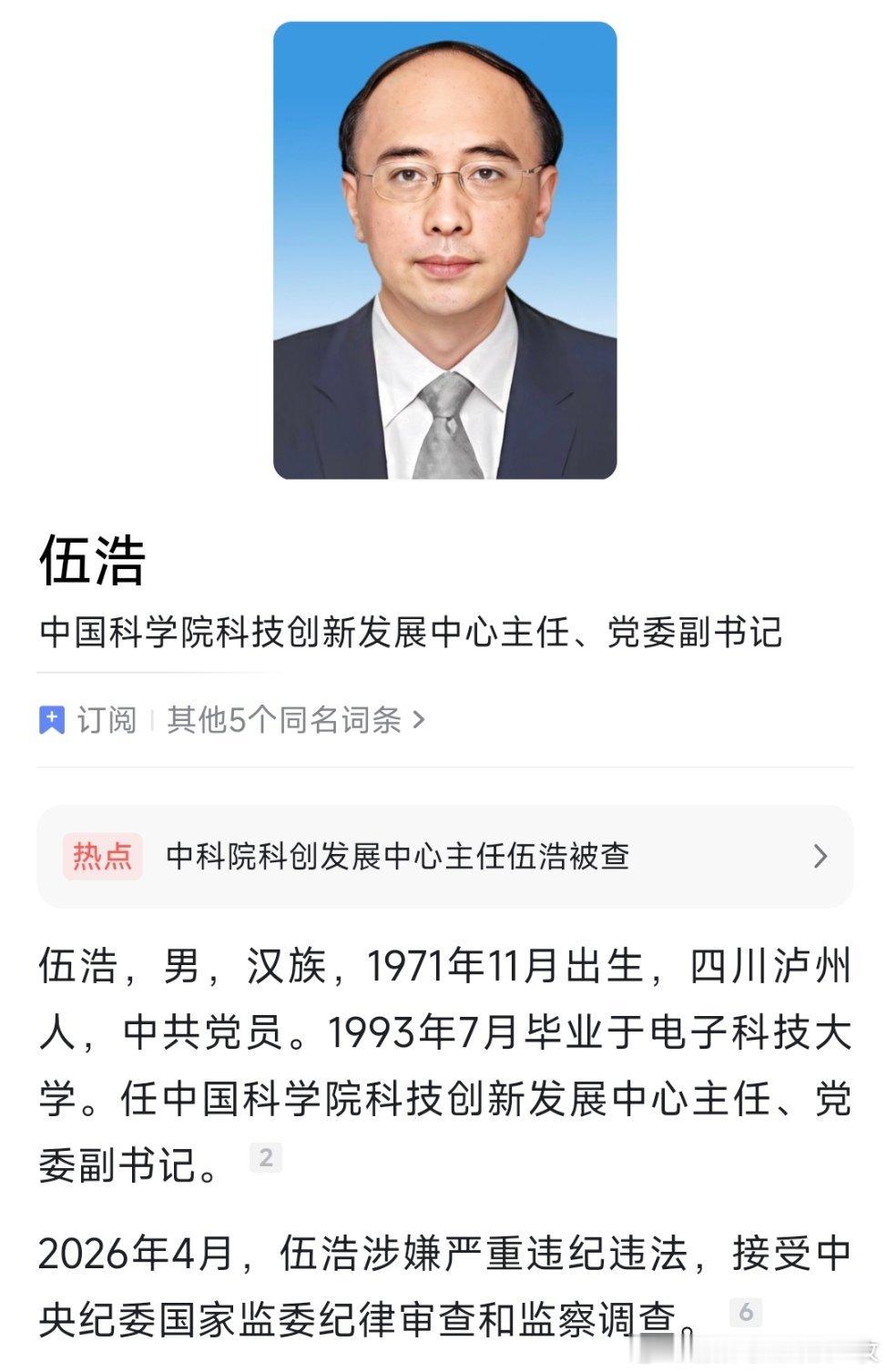 中科院科技创新发展中心主任被查中国科学院科技创新发展中心党委副书记、主任伍浩接受