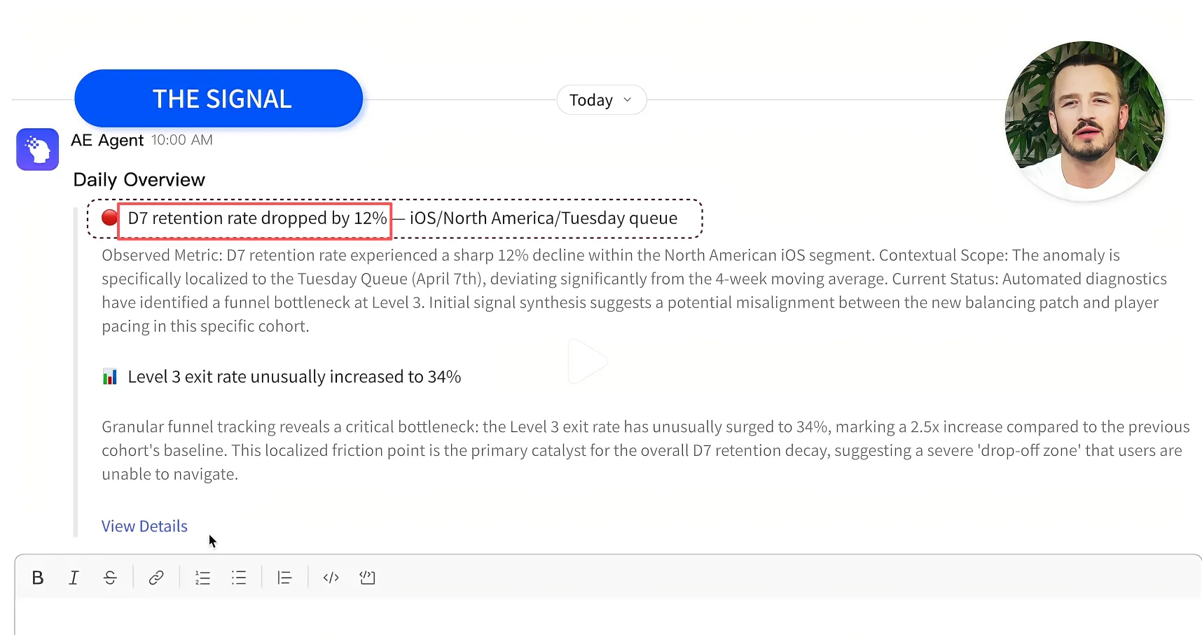 2还没等运营打开电脑,Slack里就已经收到了一条主动推送的消息,告诉你哪个指标异常了,数字是多少,影响了哪块收入。