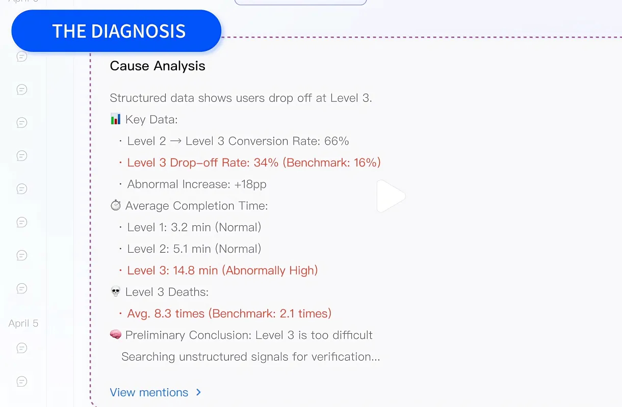 它去翻了游戏内的行为数据,又跑去看Reddit和Discord上玩家在说什么,同时还调取了内部的游戏设计文档,找到了一条过去被提过但没被重视的记录。