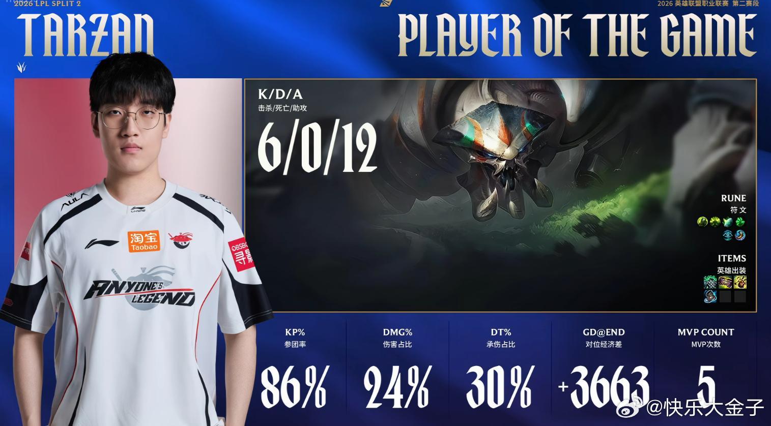 Tarzan7票MVP,6-0-12的蝎子像团战绞肉机。AL对战WBGal碾压wbg 2026lpl第二赛段 AL你我皆传奇