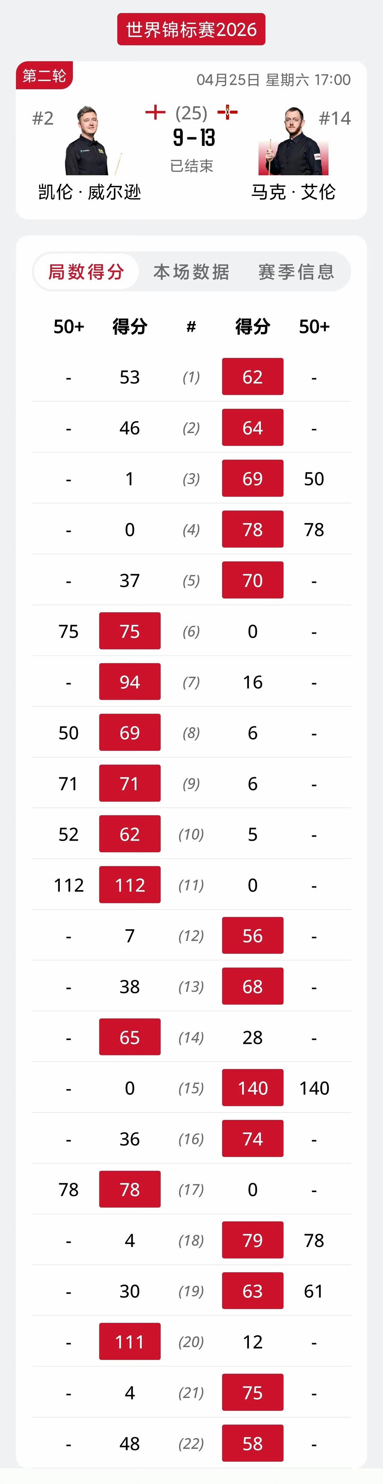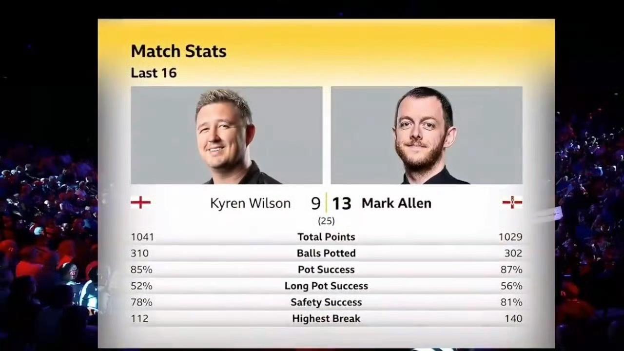 1/8决赛第三阶段,艾伦带来一波4-2的攻势,最终以13-9战胜2024世锦赛冠军威尔逊,晋级八强。