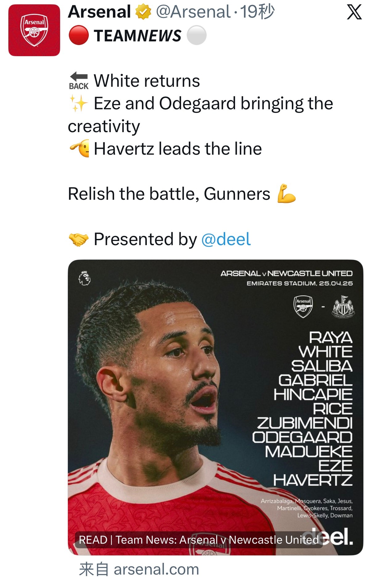 本怀特首发,萨卡回归进入替补席