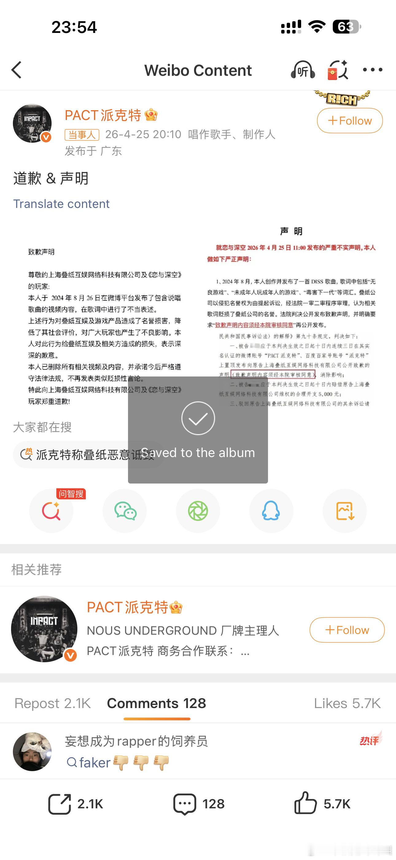 派克特道歉声明 派克特发布道歉声明,不过他设置了仅关注才能评论