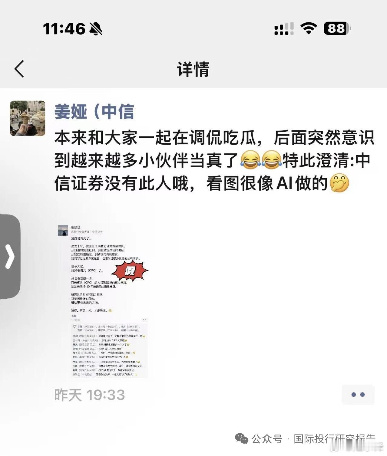 相信光!全网疯传中信消费分析师转行:把最好的自己留给更有未来的方向!中信证券正宗分析师辟谣:无此分析师疑似AI!~任泽平蹭热度!