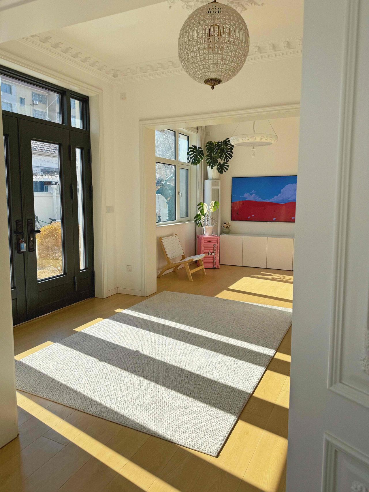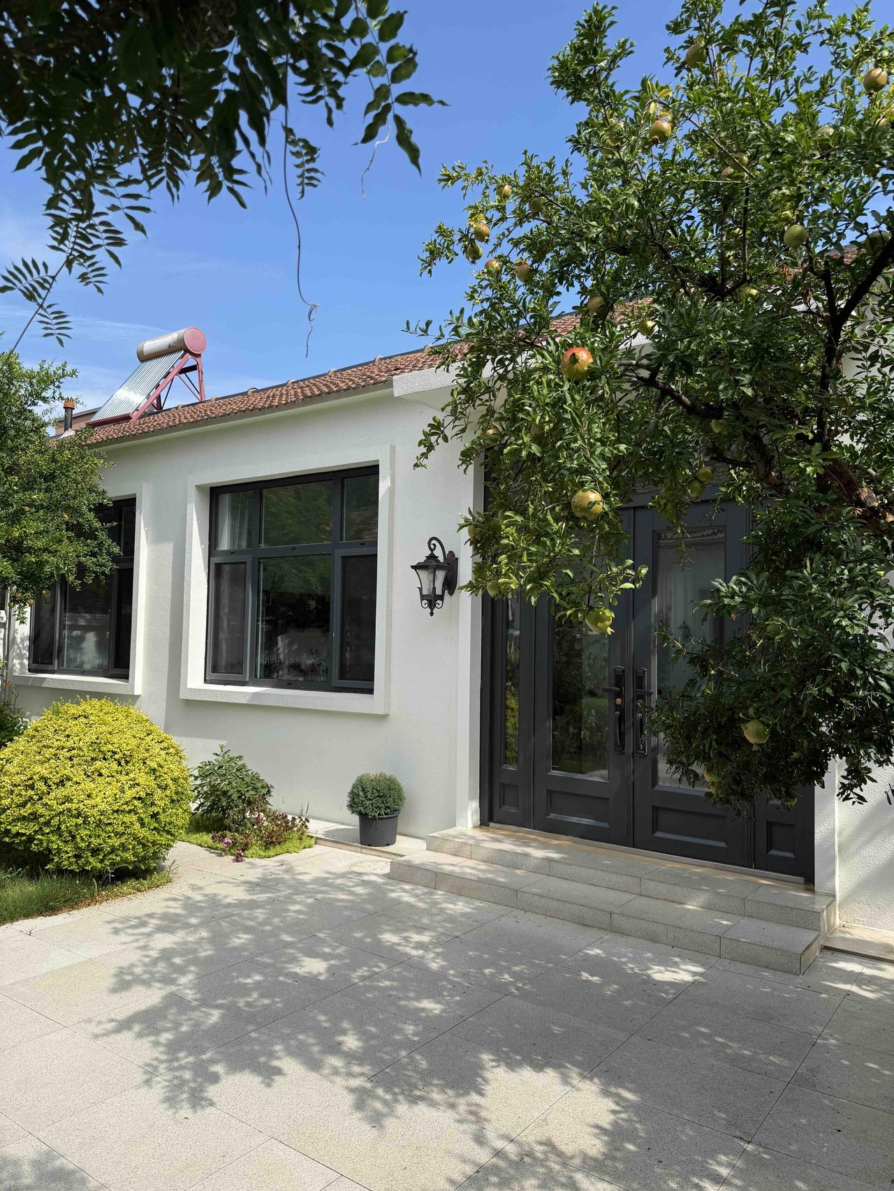 现在,改造终于完工了,推开门的瞬间,朋友们全都闭嘴了,室内92平被我打通隔断,阳光从早到晚都在屋里追着跑,而那个100平的大院子,我铺了防腐木,搭了葡萄架,种了无尽夏和几棵果树。