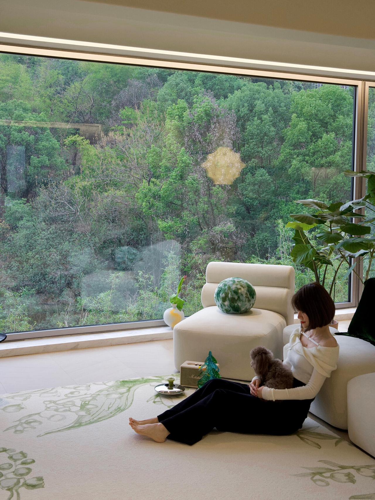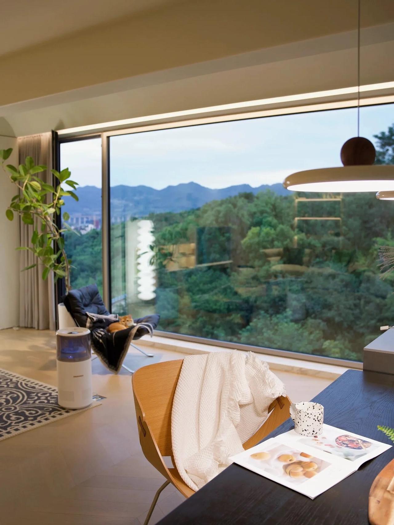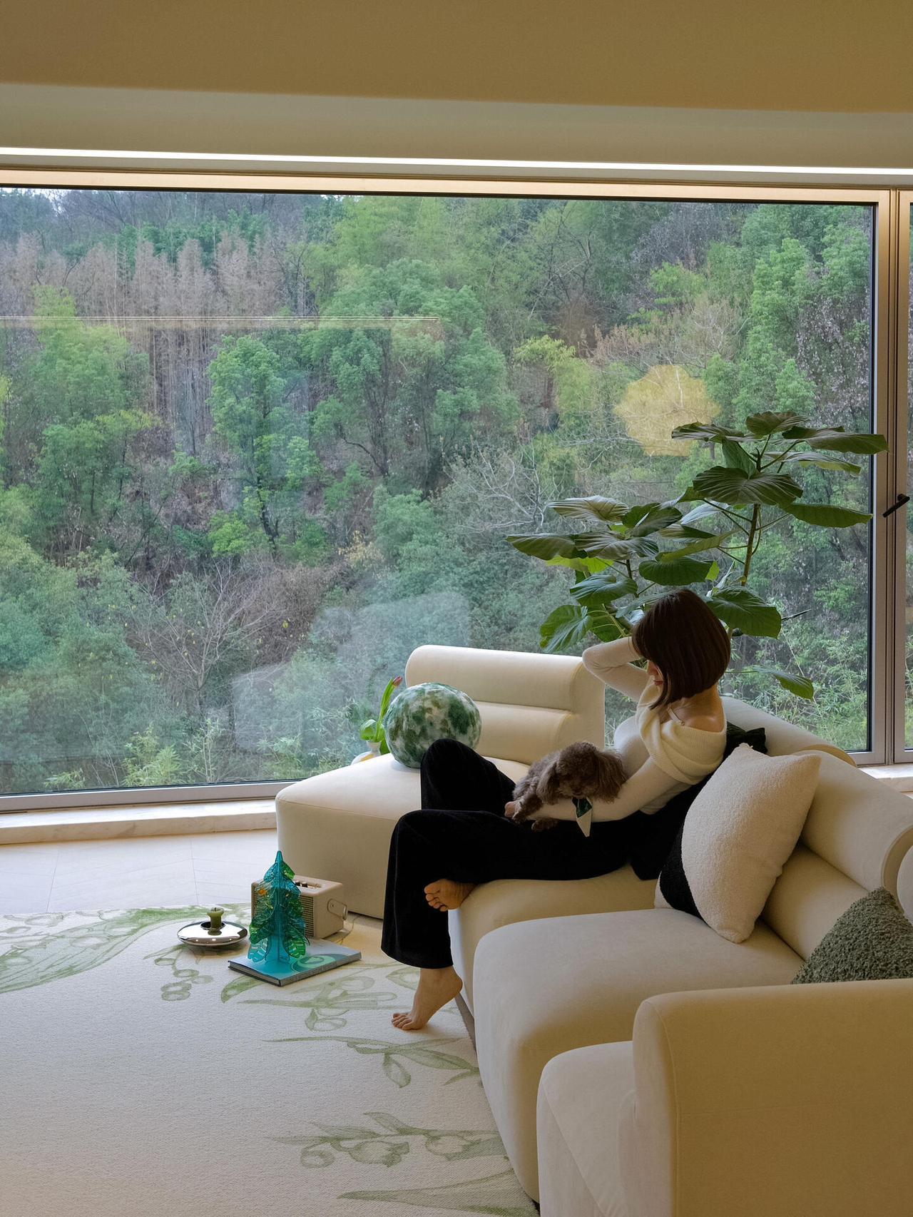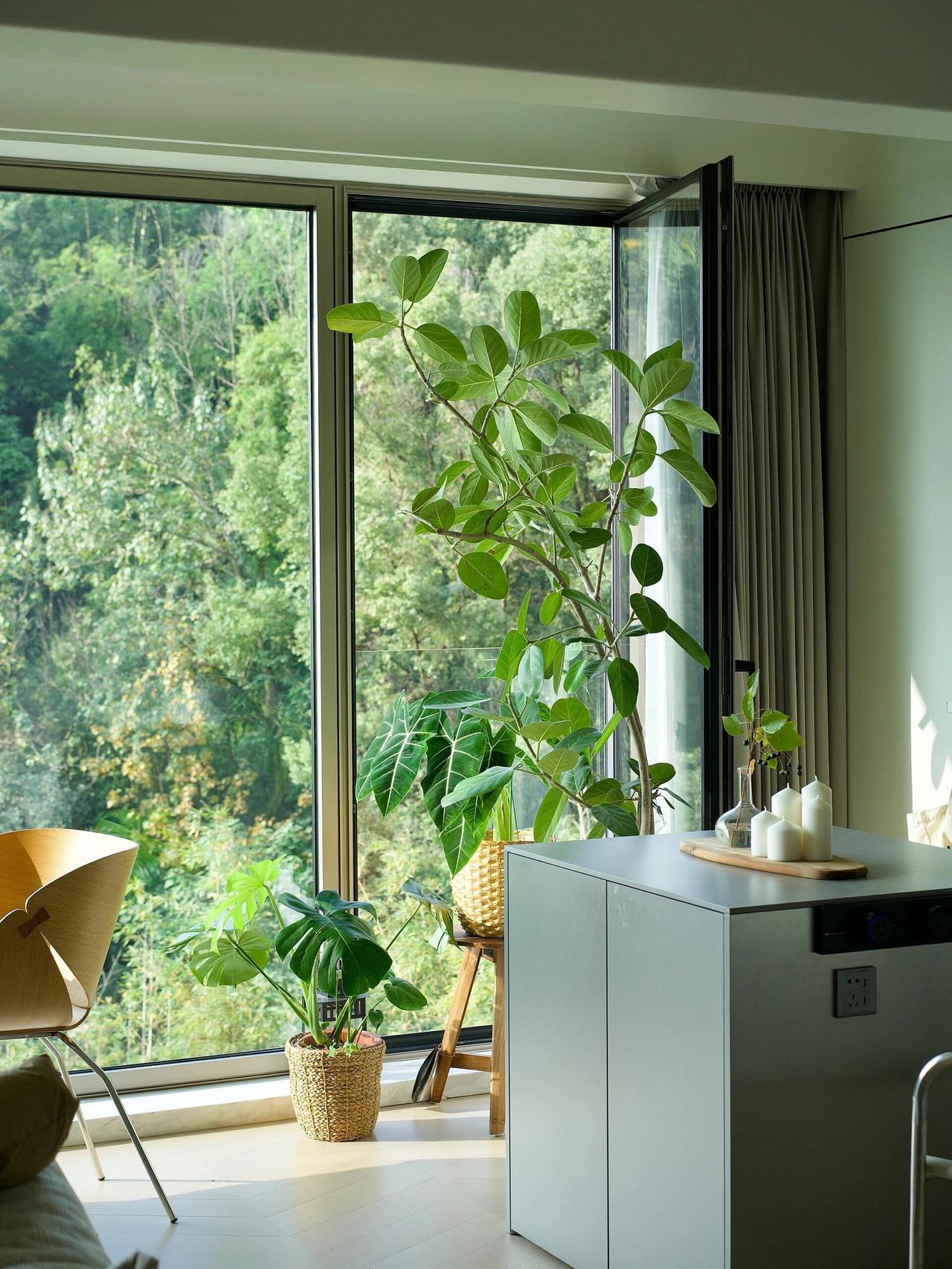 每个房间看出去的窗景都不一样,客厅和主卧满眼树绿,私密性也好,不用担心对面能看到家里,次卧、书房、衣帽间,也能看到树林,还带着点人气——不至于每个窗户都看不到一点烟火,不然就真像住在荒山野岭了。