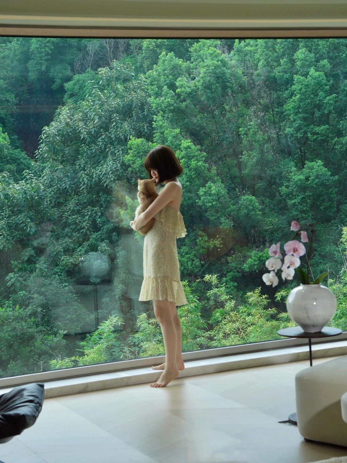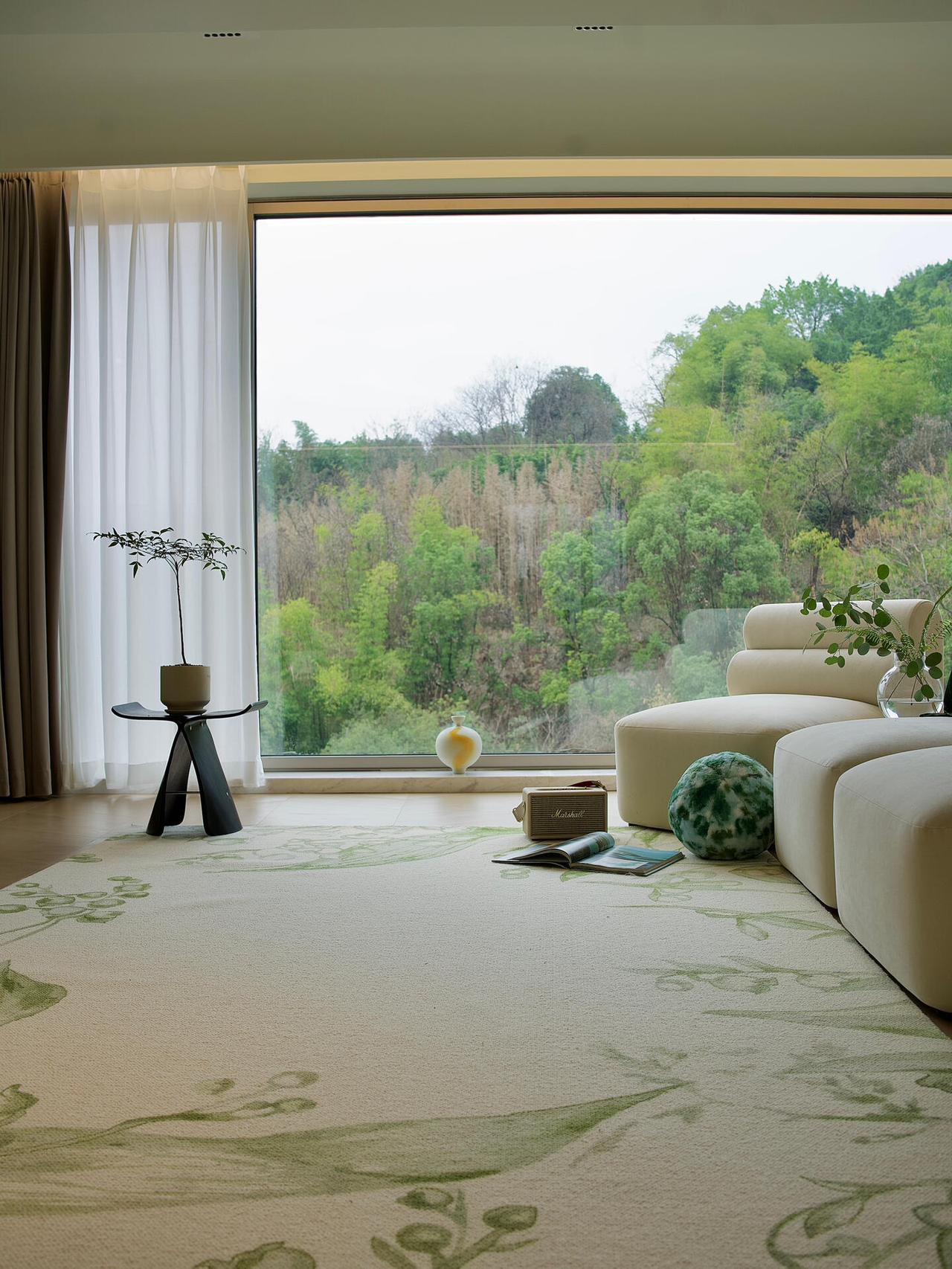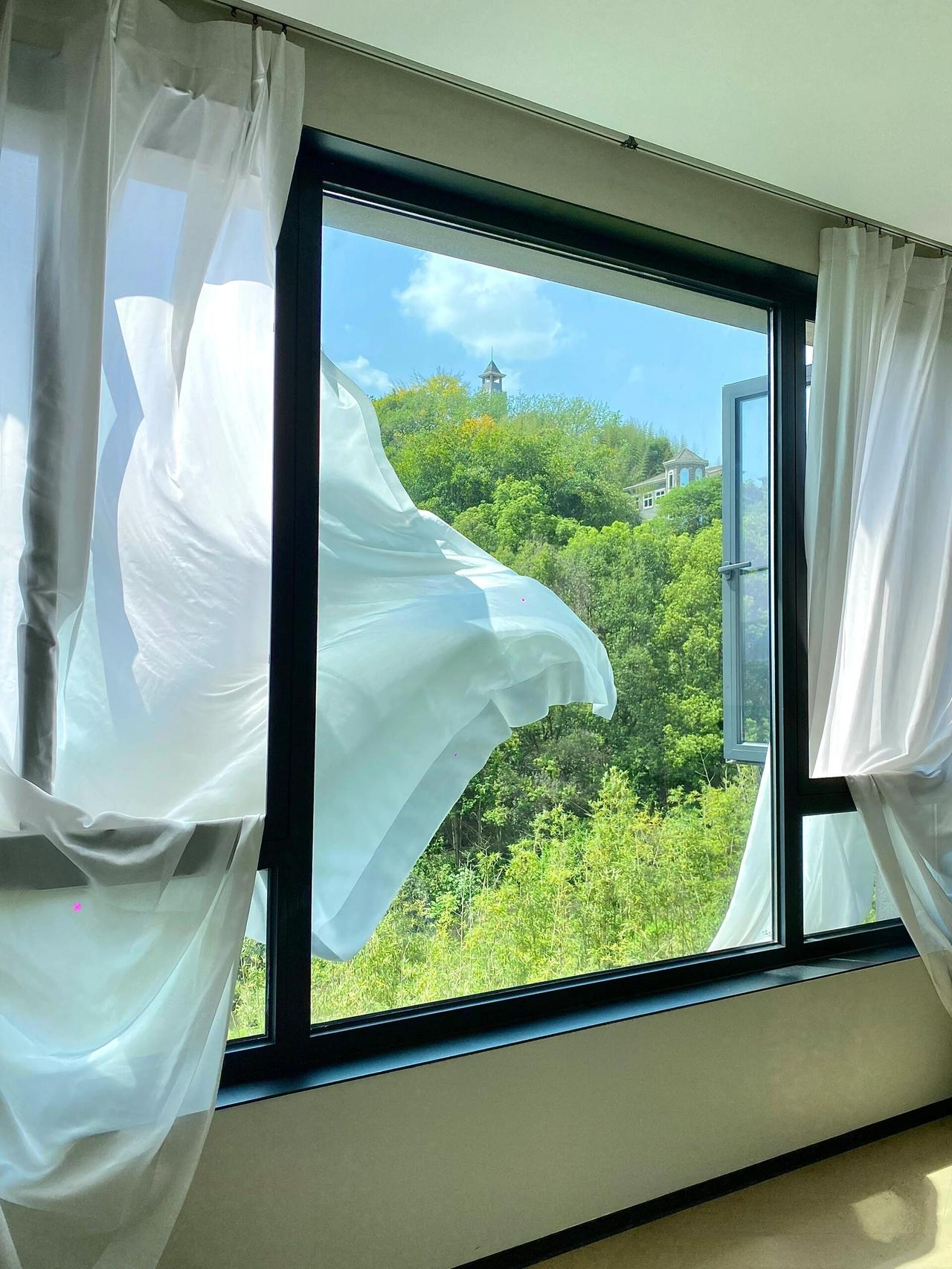 每个房间看出去的窗景都不一样,客厅和主卧满眼树绿,私密性也好,不用担心对面能看到家里,次卧、书房、衣帽间,也能看到树林,还带着点人气——不至于每个窗户都看不到一点烟火,不然就真像住在荒山野岭了。