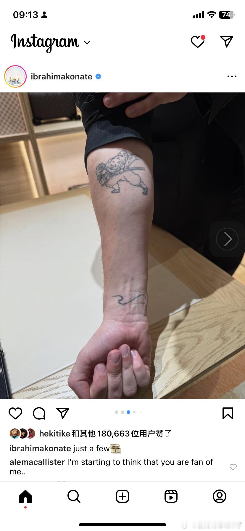 科纳特展示他的纹身和手办还拍了麦卡麦卡留言:我开始想你是我的粉丝了利物浦