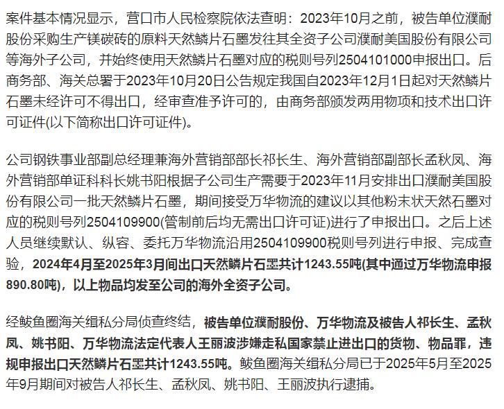 濮耐股份和营口万华物流等四名被告人,采用伪报品名的方式,逃避两用物项和技术出口许可监管,将天然鳞片石墨走私出口,已经被抓了!原先货名是天然鳞片石墨,伪造成其他粉末状天然石墨,逃避监管,共计1243.55吨。