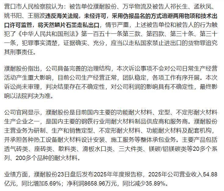 濮耐股份出口美国1200吨石墨被起诉! 濮耐股份和营口万华物流等四名被告人,采