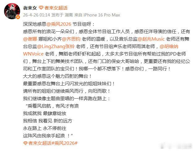 者来女发文告别乘风乘风2026二公直播,者来女只拿到33票淘汰。26号凌晨她发文,全程满满都是感恩,感谢节目组、姐姐们还有工作人员 温柔又有格局,真的太让人心疼了😭乘风2026