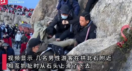 现场人群本就拥挤不堪,大家站立得十分勉强,这一推搡瞬间打破了平衡,双方当即发生激烈拉扯,混乱中,这名背包男游客重心不稳,连带身旁两名游客一起,顺着湿滑的岩石边缘往下方陡坡滑落。