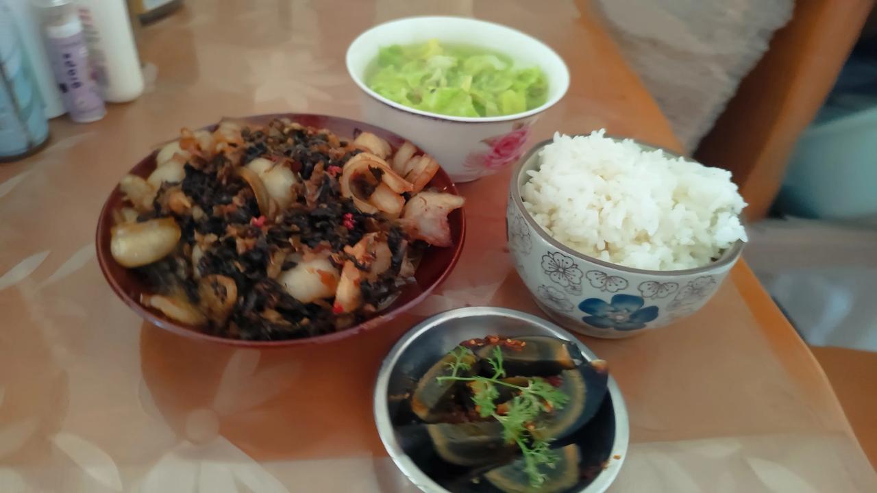 晒生活点滴 简简单单的一餐,快乐每一天!今天中午自己做的咸菜回锅肉,凉拌皮蛋,外