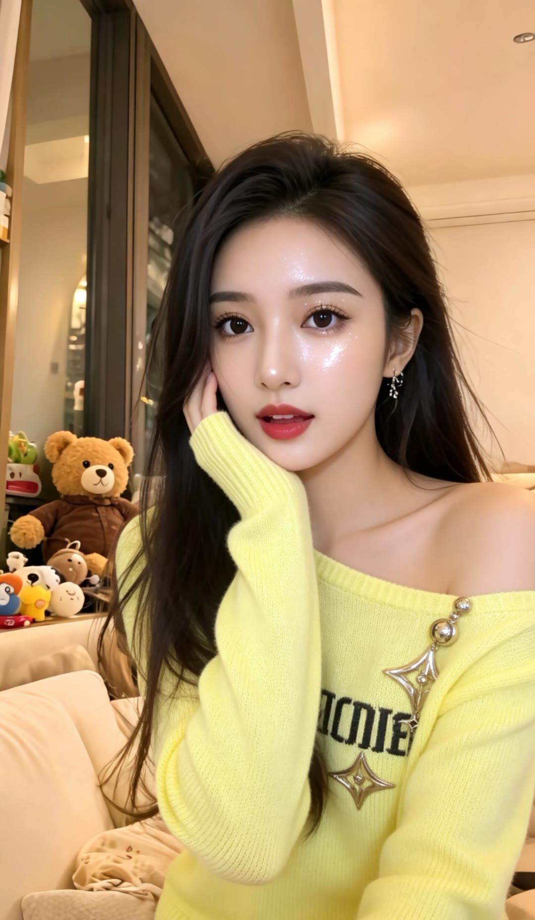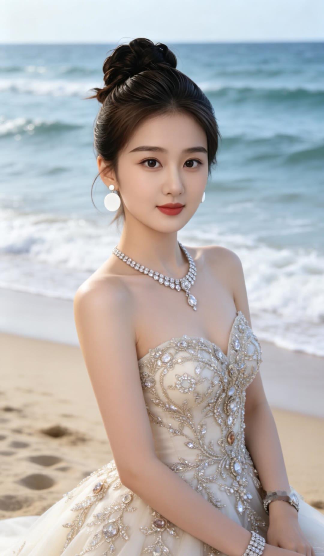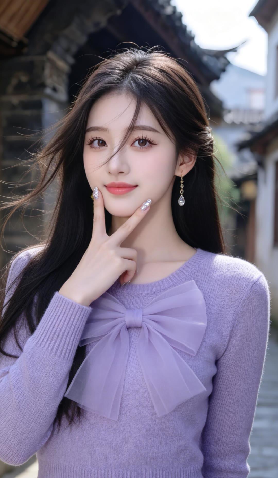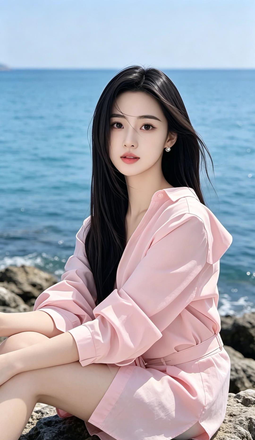 黑发如瀑映碧空,红唇轻启似春风。
