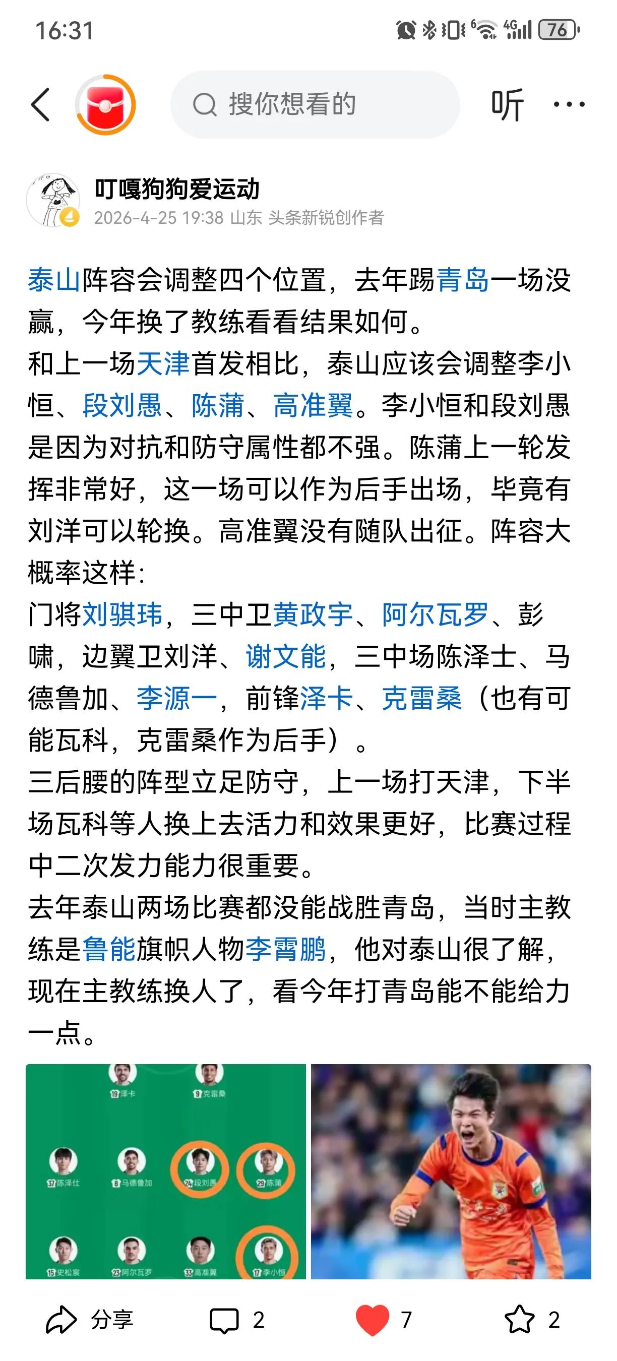 泰山首发与昨天预测完全一致,这就是适合泰山的阵型。