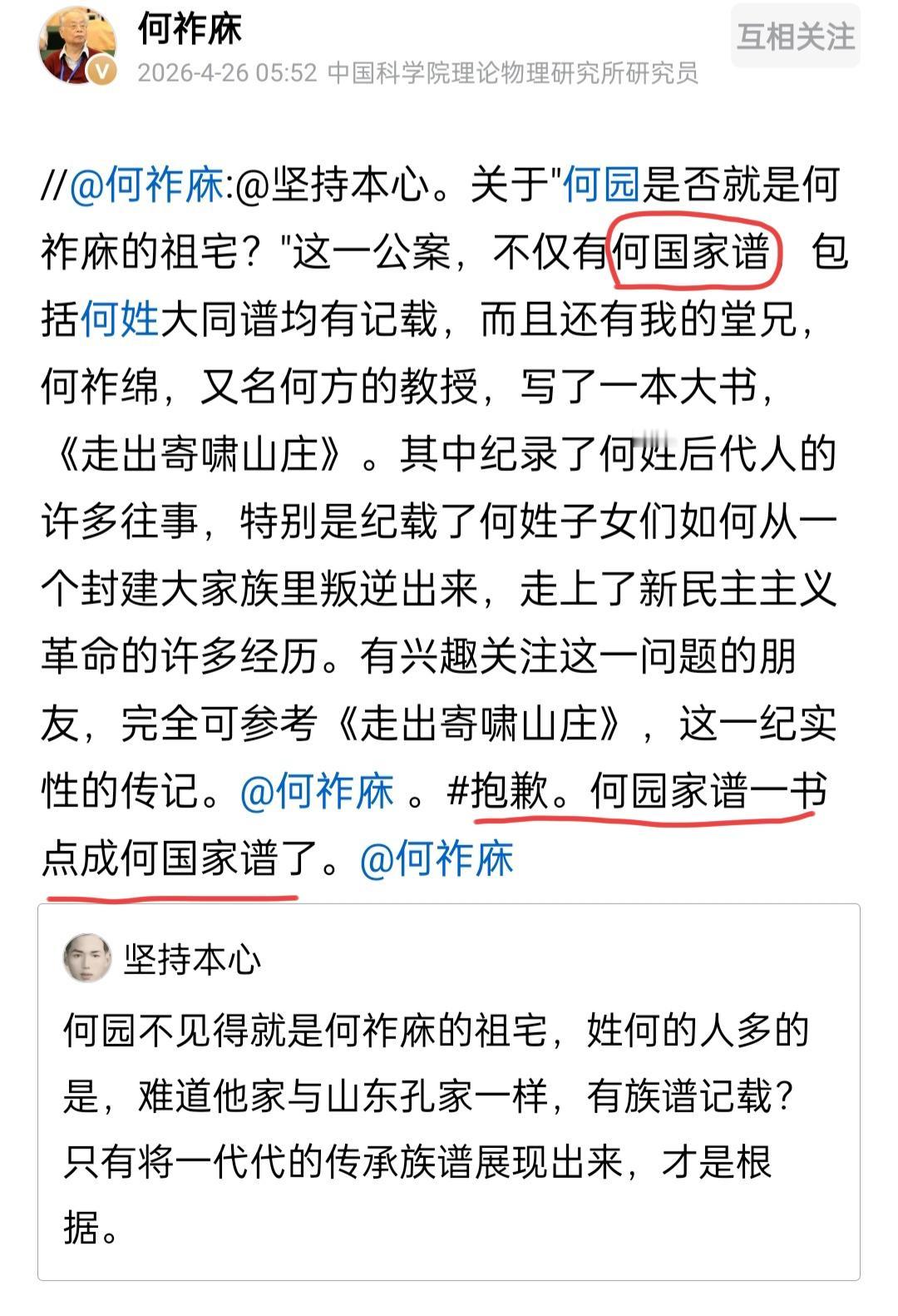 此外,何老写这篇短文时还发生了一个小插曲:他老人家年纪大了,将“何园家谱”写成了“何国家谱”,事后何老还特意致歉,向大家说明情况。