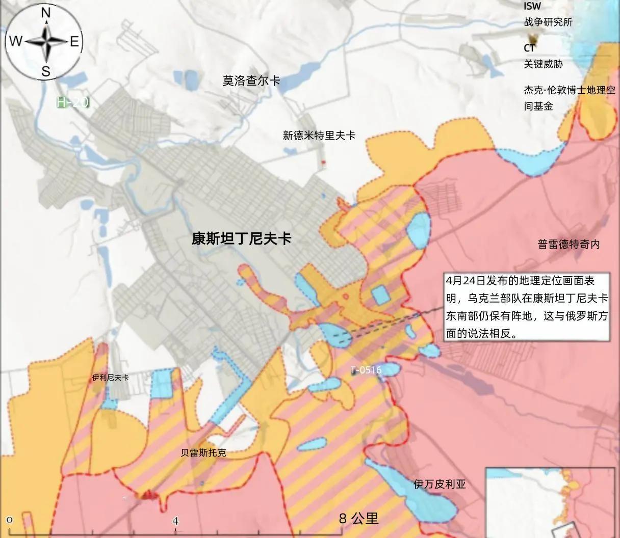 4月24日,地理定位视频显示,俄军对康斯坦丁诺夫卡东南城区乌军阵地实施精准炮火打击,同时侦察观测乌军人员在该区域活动迹象,至少可以说明乌军仍然坚守城区东南核心防御地带。俄军火力覆盖重点聚焦乌军工事、补给节点与无人机起降点,为渗透分队推进扫清障碍。